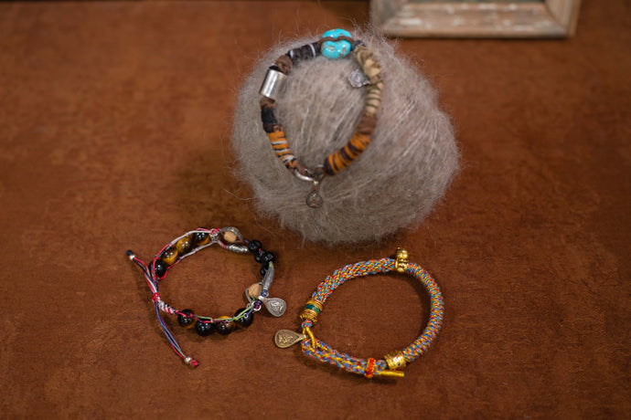 We select the first wool of spring from sheep pastures at the foot of Mount Kailash and blessed red silk threads from the Jokhang Temple, hand-twisted by Tibetan grandmothers into red string bracelets.