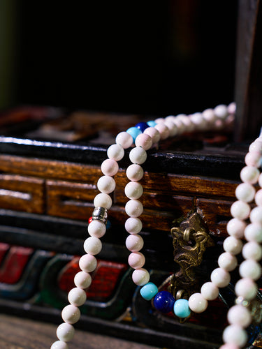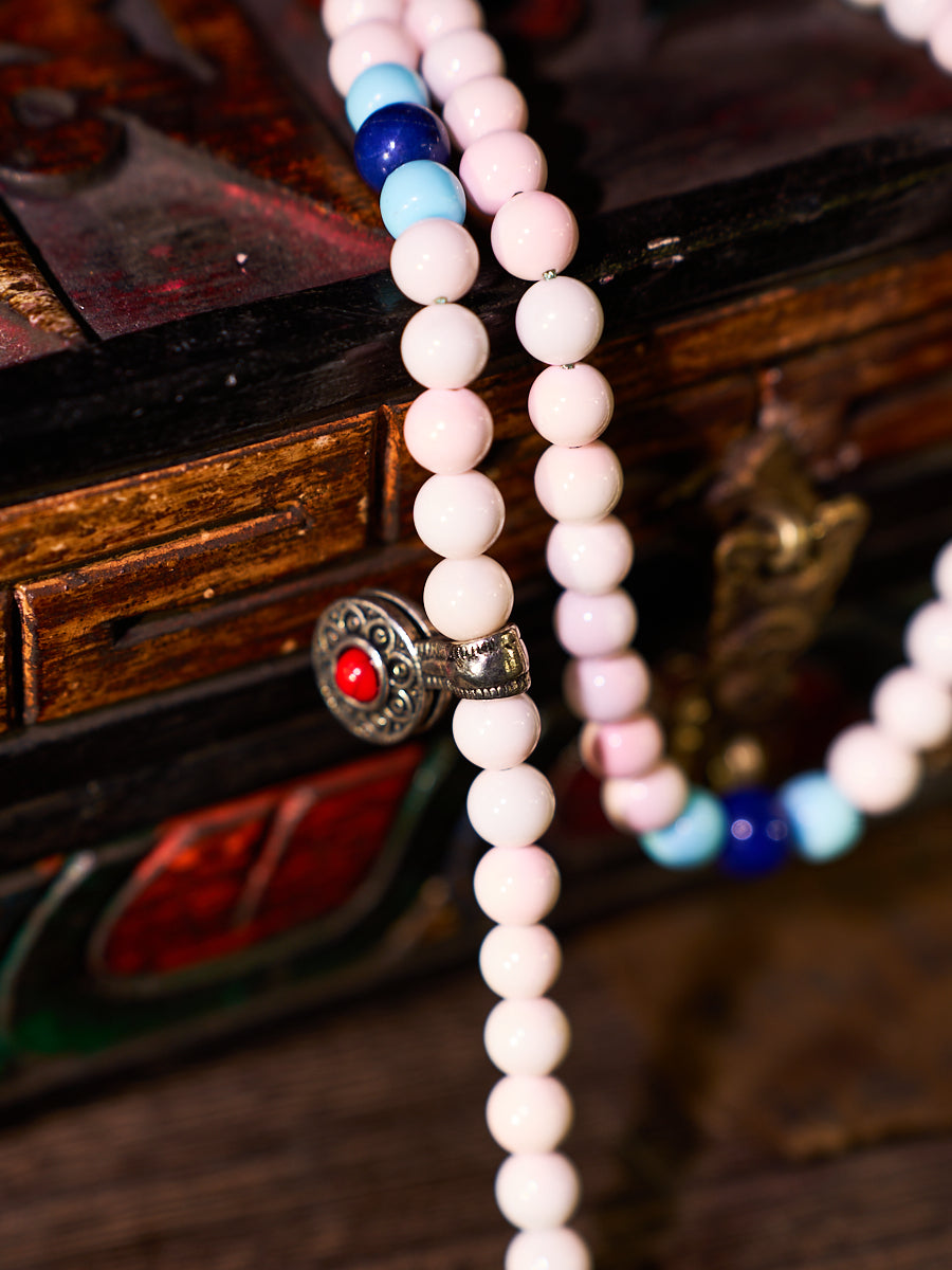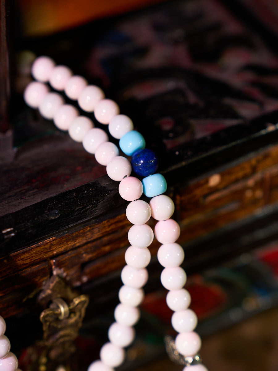 This handcrafted bracelet blends Pink Shell and Pink Tridacna—both known for soothing emotional tension—with Lapis Lazuli, a stone revered for clarity and inner truth. Together, they create a calming mala that stabilizes the mind, eases stress, and supports gentle emotional healing. The soft white-pink tones symbolize purity and compassion, while the accents of Lapis bring wisdom and peaceful awareness. Ideal for daily wear or meditation, this piece helps cultivate serenity, confidence, and balanced energy.