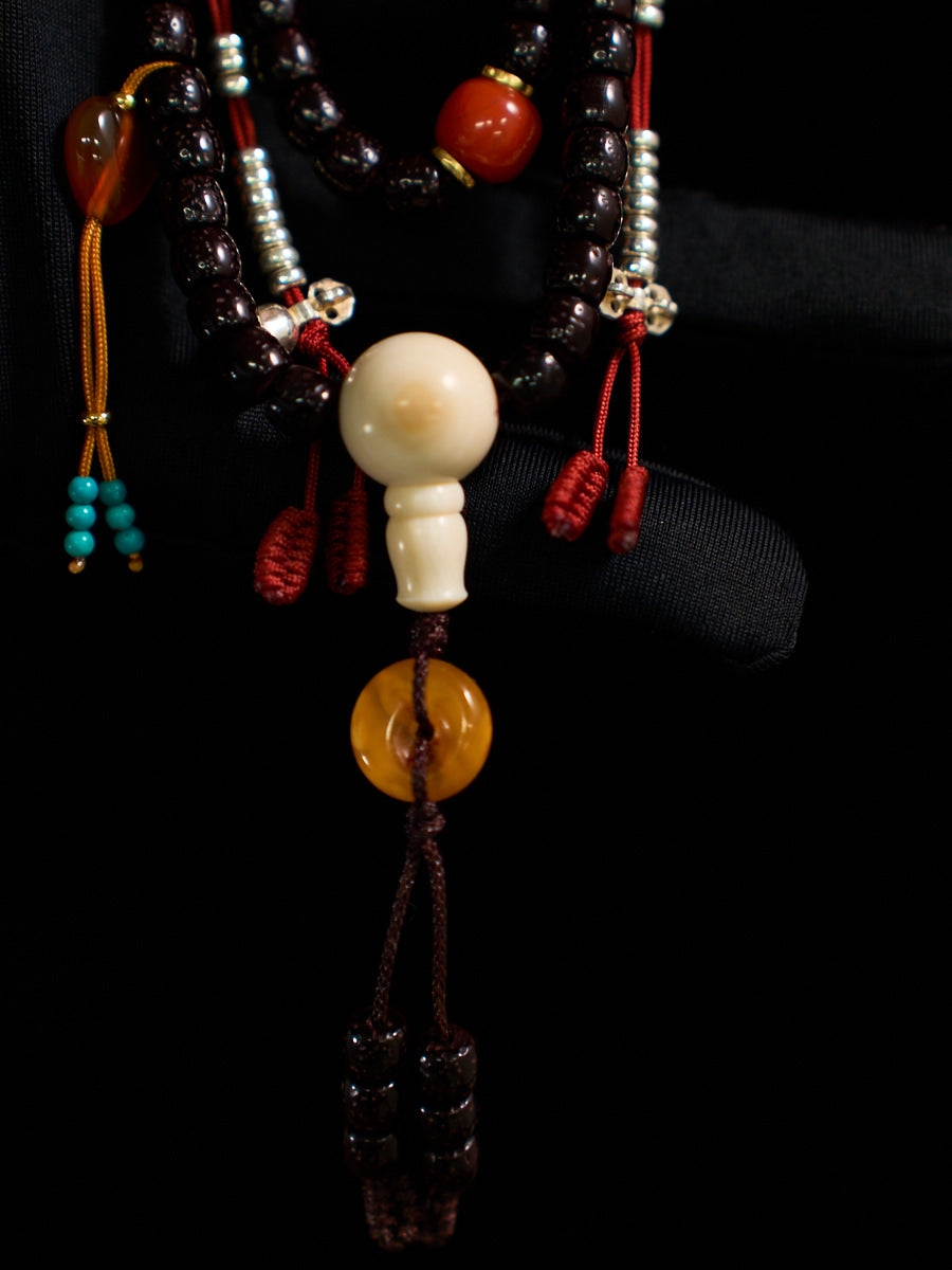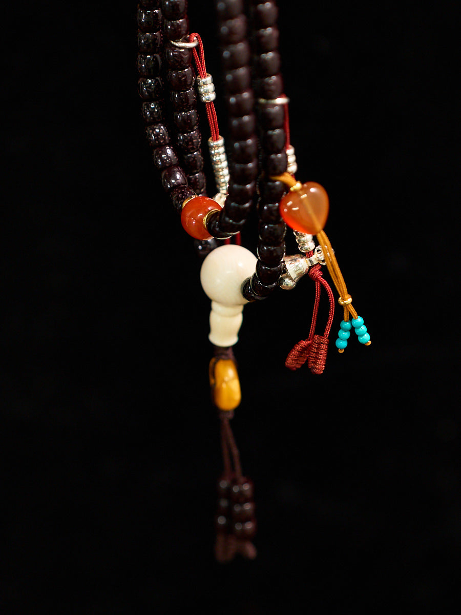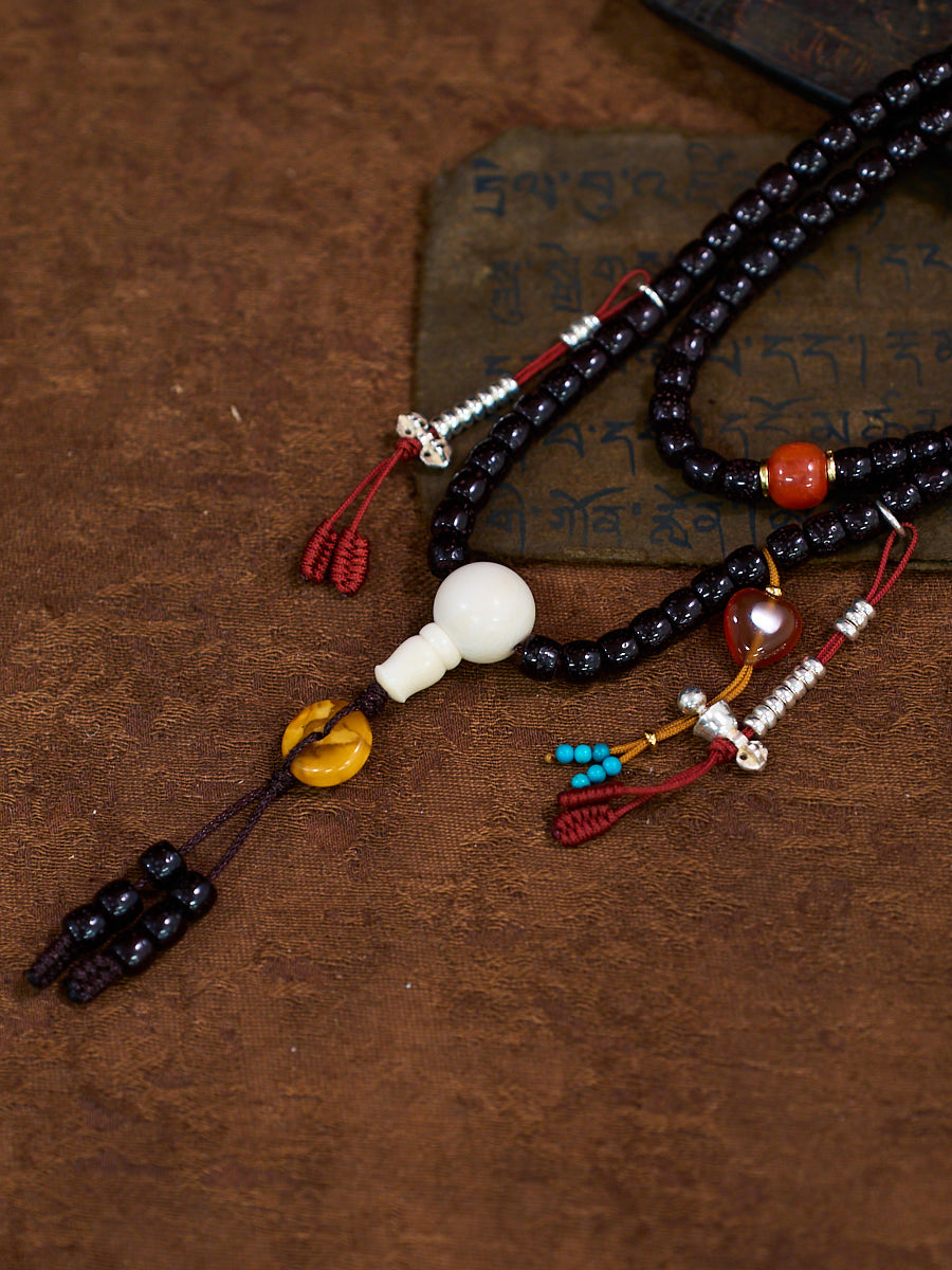 The bracelet is strung with traditional star-moon bodhi—warm brown beads dotted with natural “moon eyes,” cherished across the Himalayas for their quiet, meditative presence. Turquoise and South Red agate accents add bright auspicious color, while the beeswax back-cloud bead and finely carved ivory guru bead complete the central structure. Two sterling silver counters hang on the sides, giving the piece the practical function of a counting tool as well as the visual feel of a nomadic altar accessory.