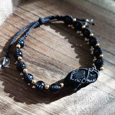 Black Tourmaline Shield Bracelet – Handcrafted Protection with Brass Accents