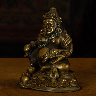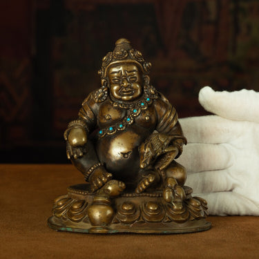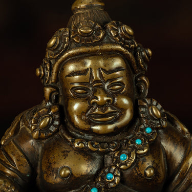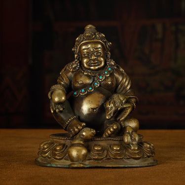 13th-century Pala-style turquoise-inlaid Yellow Jambhala statue. The Pala style, popular in the 11th-12th centuries in Northeast India, influenced this Yellow Jambhala statue, likely crafted in Western Tibet. Combining local aesthetics, it formed a unique taste and style, also known as 'Tibetan Pala.' Among Pala-style statues, this one is relatively large. During this period, most Tibetan Pala statues were smaller, making examples of this size rare.