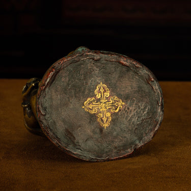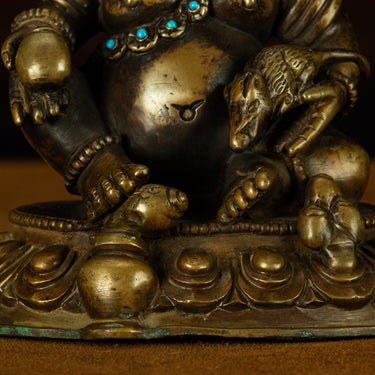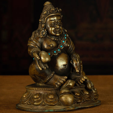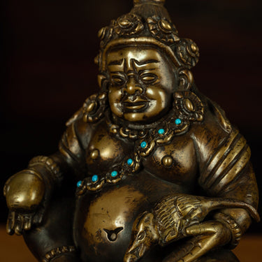 Yellow Jambhala, depicted with one face and two arms, has a plump face with delicate features, slightly tilted head, imparting a dynamic sense to the entire statue, seemingly bringing it to life. Adorned with a majestic crown and other exquisite ornaments, the deity's robust and dignified figure exudes a powerful aura. With a broad chest and prominent abdomen, the deity's ears are adorned with earrings, and the limbs are adorned with bracelets. The deity's right hand holds a jewel-spitting mongoose, symbolizing wealth, while the left hand clasps a treasure-spouting mongoose, signifying prosperity. Seated atop a lotus throne with a relaxed yet dynamic posture, the deity's right foot rests on a treasure vase, symbolizing wish-fulfilling abilities. The sturdy and low lotus throne firmly supports the entire statue.