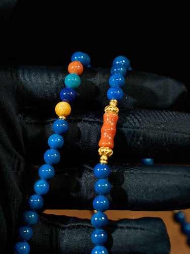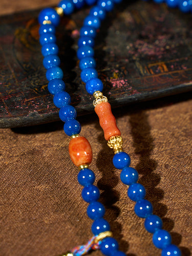 This Azure Rhythm Agatized Corale Mala Necklace is composed of deep blue agatized corale beads accented with warm mineral tones and subtle silver details. The steady repetition of blue beads creates a visual rhythm—calm, continuous, and grounding—echoing the quiet cadence of breath and mantra. The contrast between cool azure and warm accents adds depth without breaking harmony, allowing the piece to feel balanced rather than ornamental.