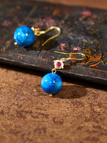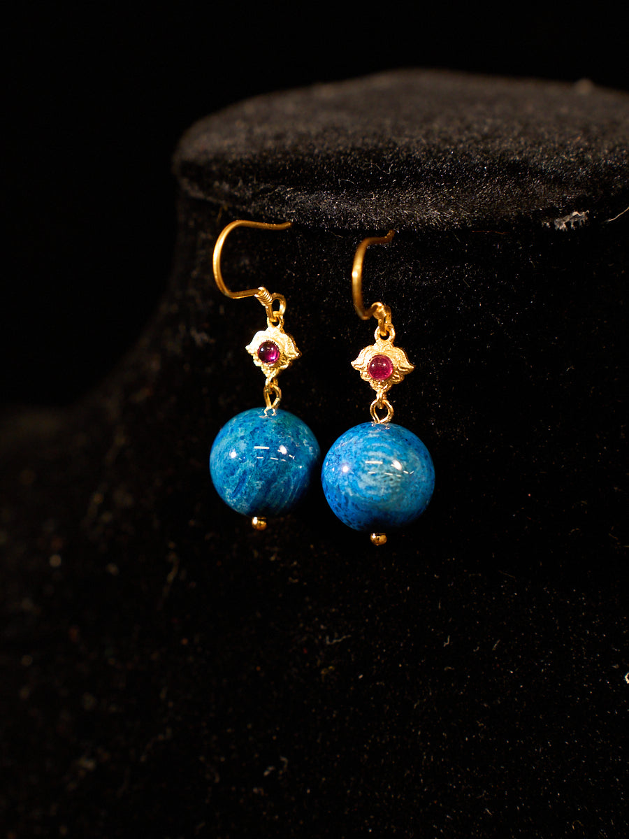 Finished with warm gold-toned silver accents, the design remains restrained and intentional, framing the stone without interrupting its natural rhythm. As the earrings move gently with the wearer, they offer a sense of grounding and calm continuity. Worn close to the face, Azure Drop is not meant to draw attention, but to support presence—an expression of quiet balance, clear awareness, and composed inner strength.