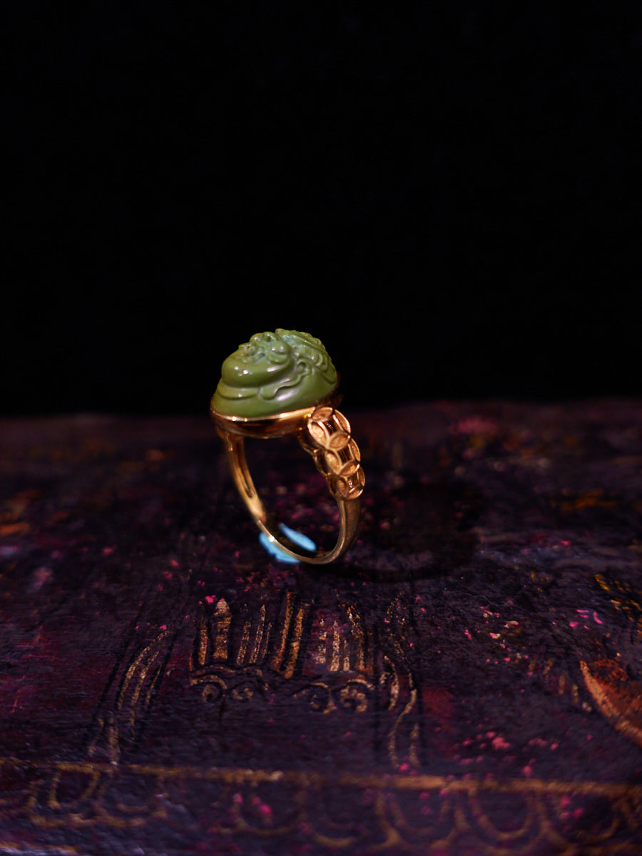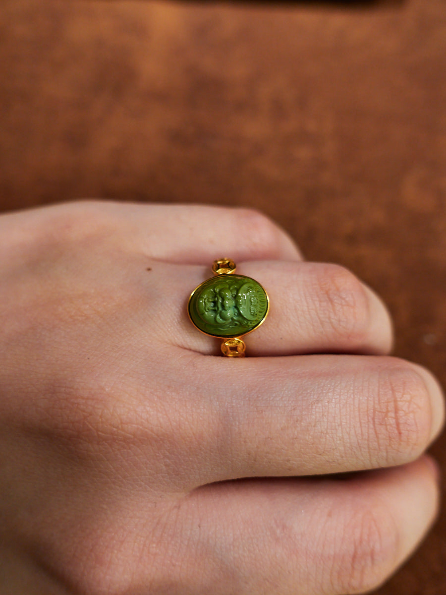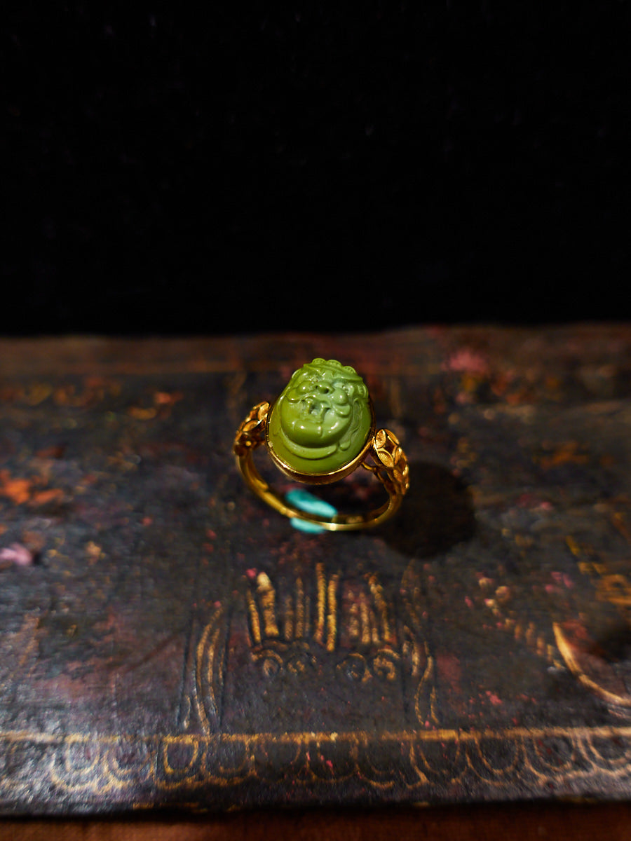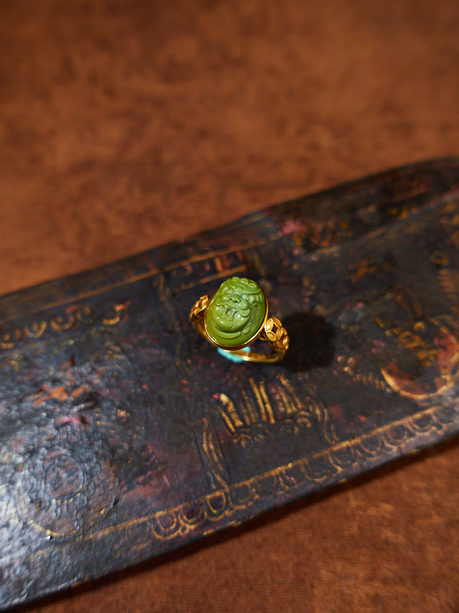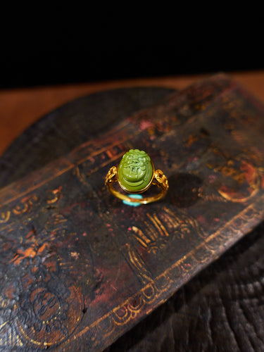 This handcrafted ring features Mahakala, the fierce protector deity in Tibetan Buddhism, symbolizing power, fearlessness, and divine protection. His wrathful expression embodies great compassion, destroying negativity and shielding the wearer from harm while bringing strength and prosperity.