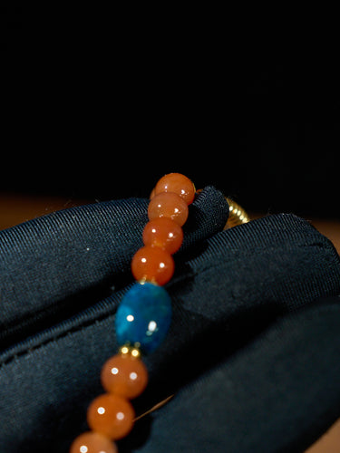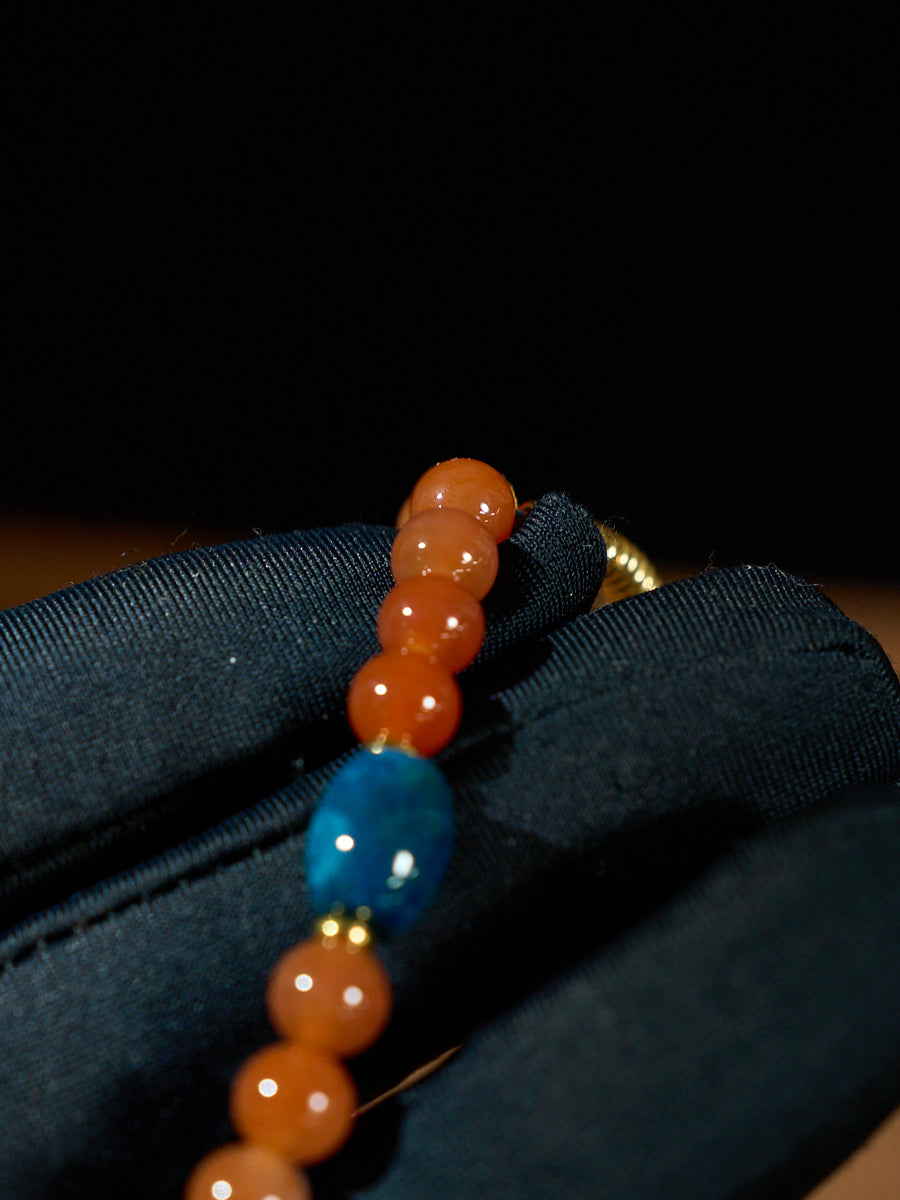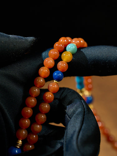 This mala is defined by its clear, steady blue tone—calm, focused, and quietly powerful. The round Agatized Corale beads form a continuous rhythm, punctuated by warm accent stones that gently anchor the design. The central drop bead and tassel structure create a natural point of pause, guiding the eye and the hand back to center. There is nothing excessive here—only balance, order, and direction.