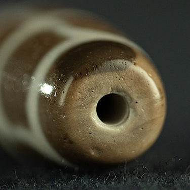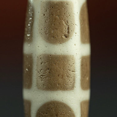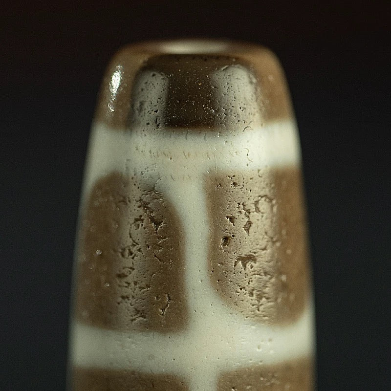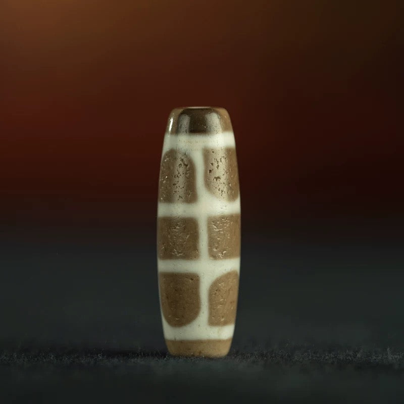 This Dzi bead features the Great Illusion Net totem, representing the mandala manifestation of Vajrasattva’s Illusion Net, as well as the endless wheel of sacred transformations embodying the Body, Speech, and Mind of all Buddhas.