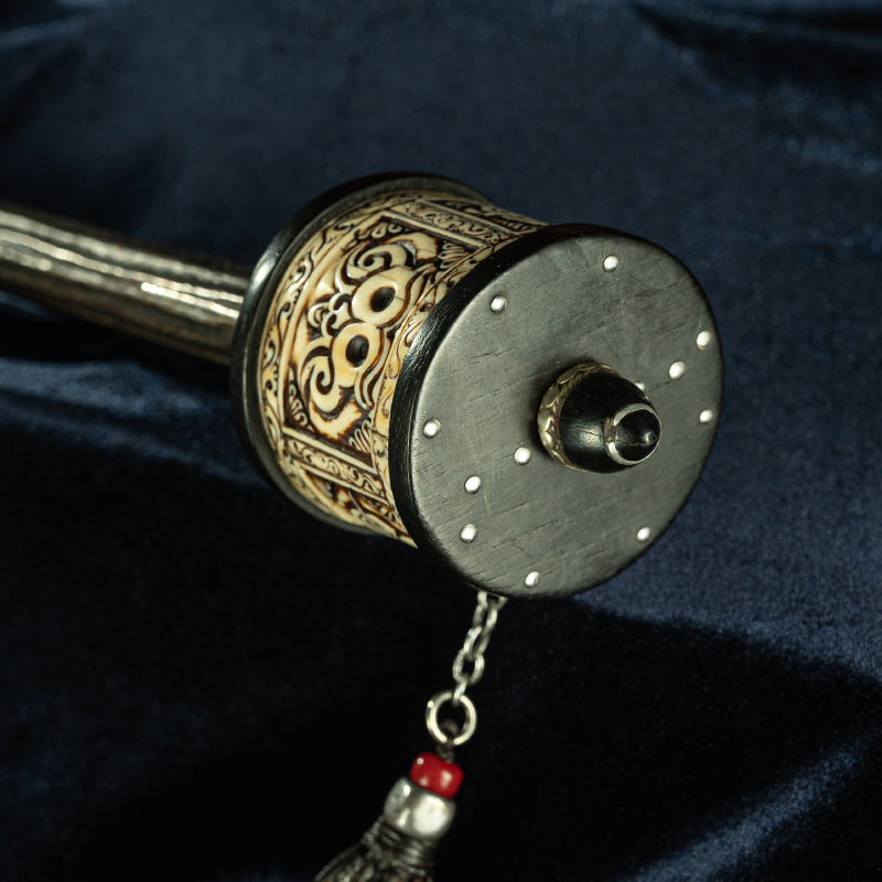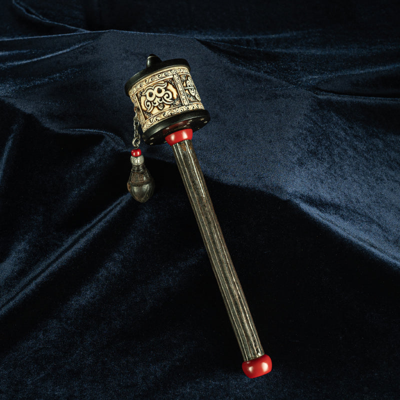 This auspicious ritual container from the Qing monastery lineage is of moderate size, crafted with authentic technique from fine old material. The body is carved with motifs of Zhiwaba and the Cross Vajra, executed with mature craftsmanship and bold, powerful lines. The top and bottom are sealed with rosewood, the handle encased in Tibetan silver, and both ends set with high-quality Shoba stones.