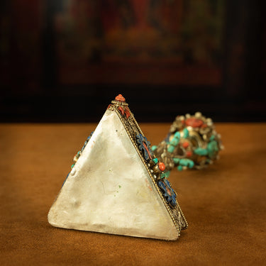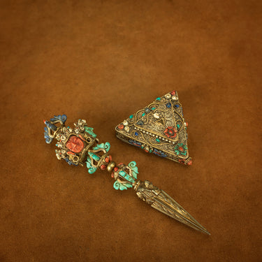 The package includes: Extremely Rare Tibetan Top Five-Sided Puba Vajra with Coral, Turquoise, Lapis Lazuli, and Giant Clam*1