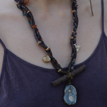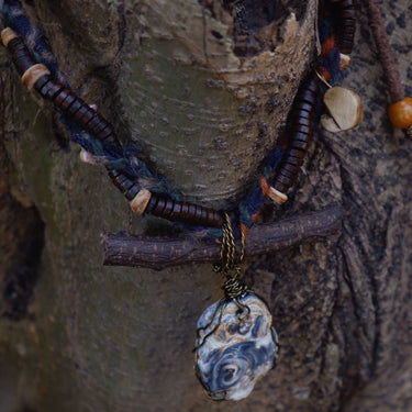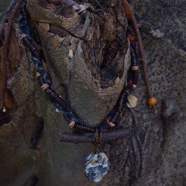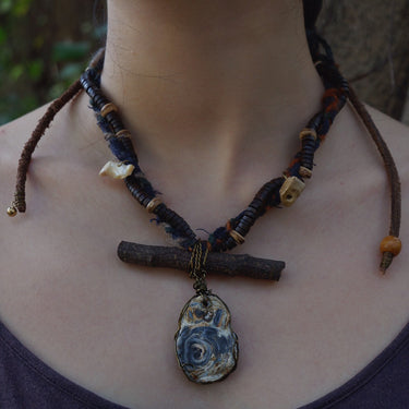 Unleash your inner strength with the Primal Energy Pendant Necklace with Natural Elements. This statement piece combines the raw beauty of plant-dyed cotton threads, wooden beads, and tree branches, paired with crystal clusters, vintage shells, and aged brass accents. The centerpiece—a stunning pendant crafted from an ancient shell—is elegantly wrapped in brass wire, symbolizing the grounding and revitalizing power of Earth’s primal energy.