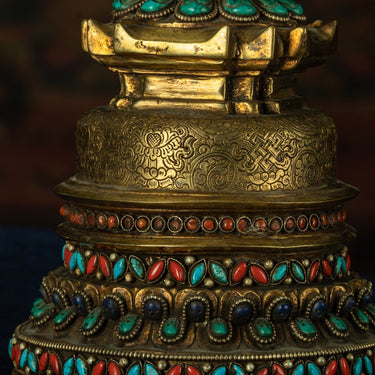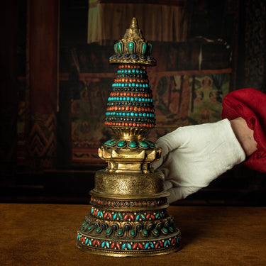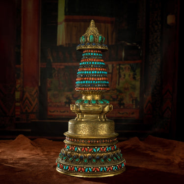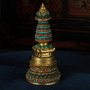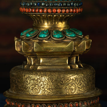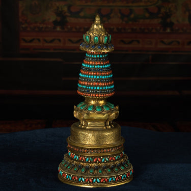 This is the old Kadam Pagoda that was passed down from Tibet in the Qing Dynasty and is full of gold and water and inlaid with precious stones. The size of the Kadam Pagoda in front of you is not small among the Kadam Pagodas. The top-notch gold water carving and almost full-scale gem inlay can definitely be regarded as collection level. The Kadam Pagoda is a type of pagoda that features a bell-shaped bowl. It is said that this kind of pagoda was introduced to Tibet by the eminent Indian monk Atisha in the 11th century when he came to Tibet to teach Buddhism. Because it was popular in the Kadam sect temple founded by Atisha's disciple Zhongdunpa, it is commonly known as the "Kadam pagoda".