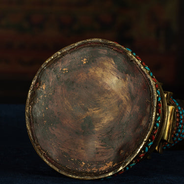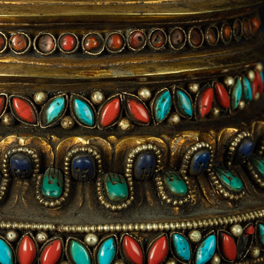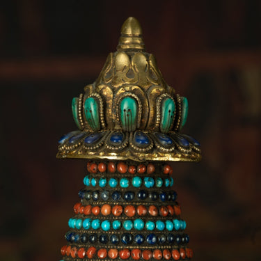 The pagoda is covered with a lotus umbrella. The thirteenth-level phase wheel means "Thirteen Days" and represents the thirteen stages of cultivation. The bowl-shaped tower body is decorated with diamond circles. The circular tower base and the lotus petals inlaid with gems at the bottom are wide and full, which extremely shows the luxury and beauty. The overall production process of the tower is exquisite and the shape is regular. The most amazing thing is the turquoise, lapis lazuli and coral inlaid throughout, and almost all of these gems are originally inlaid in the Qing Dynasty. Of course, there are also very few beads that have been supplemented, which also shows that the year is in place to open the door. To say that such a collection-level Kadam Pagoda must have been of extraordinary origin.