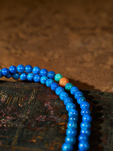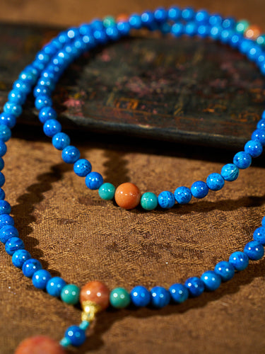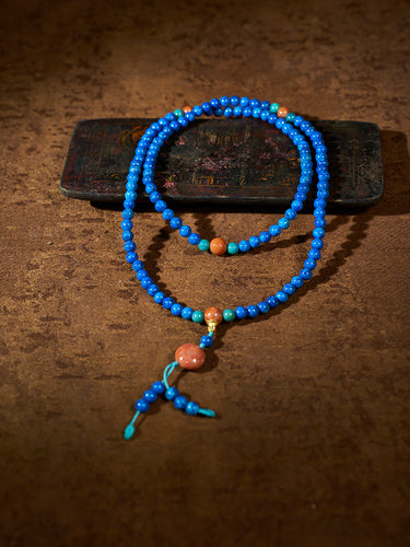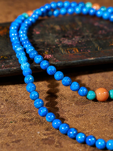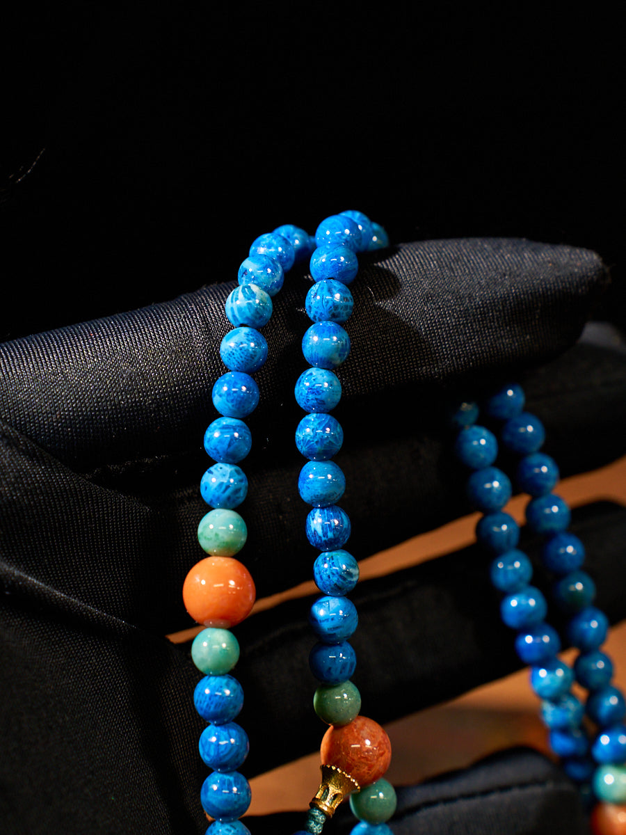 This mala is defined by its clear, steady blue tone—calm, focused, and quietly powerful. The round Agatized Corale beads form a continuous rhythm, punctuated by warm accent stones that gently anchor the design. The central drop bead and tassel structure create a natural point of pause, guiding the eye and the hand back to center. There is nothing excessive here—only balance, order, and direction.