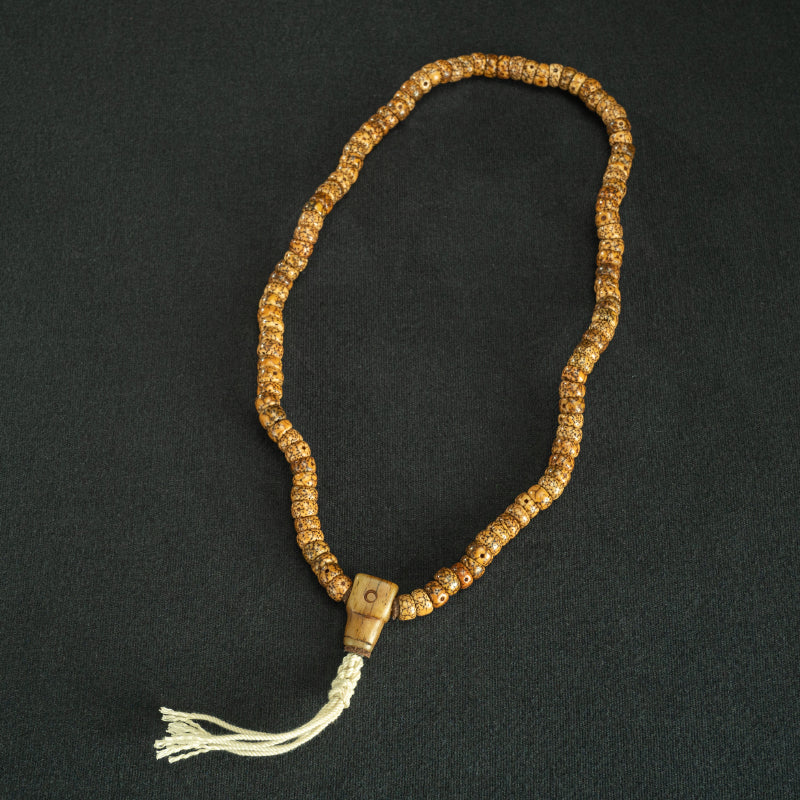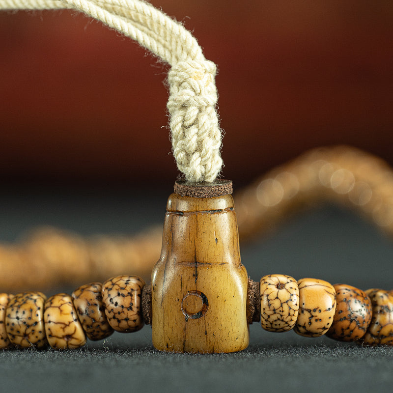 This is an extremely rare creamy yellow Star-and-Moon Bodhi mala. The entire strand is of excellent quality, with naturally refined crackle patterns, rich texture, and the uncommon Medicine Bead form. While Star-and-Moon Bodhi beads can develop a beautiful reddish-brown patina within just a few years, achieving the coveted creamy tone is exceptionally rare and requires centuries of natural transformation.