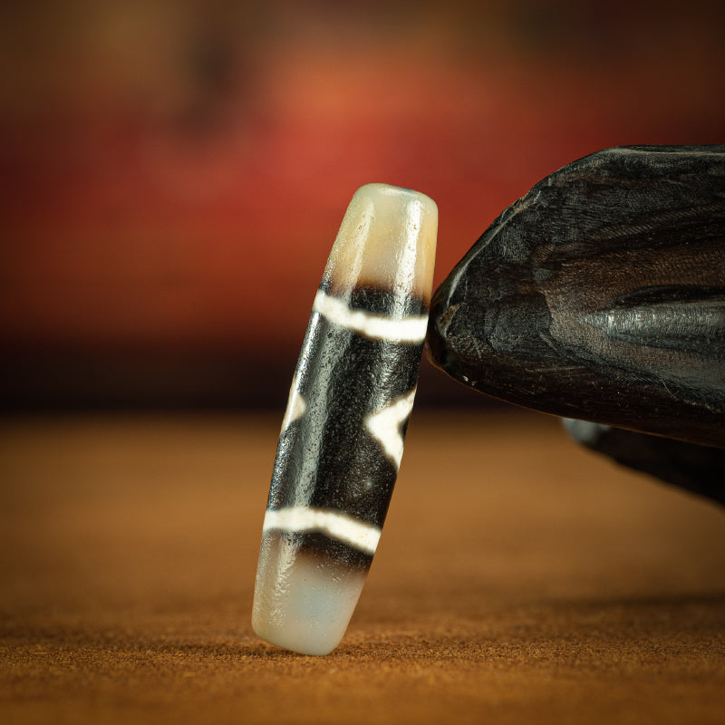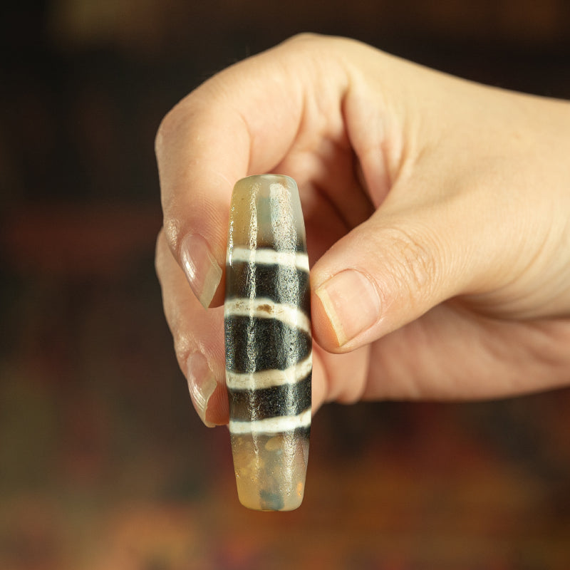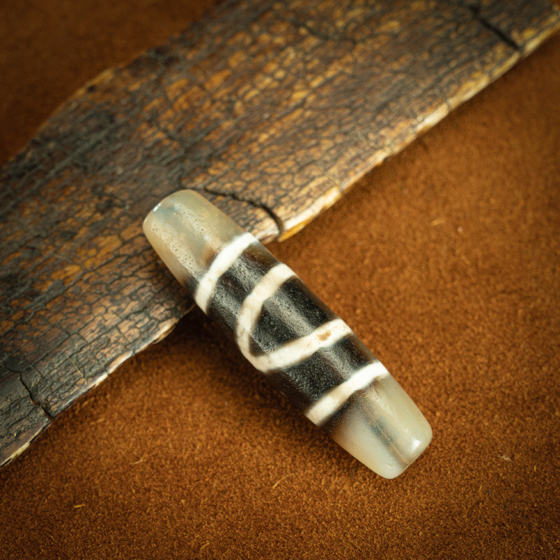 Line-pattern Dzi beads exist in many varieties—single-line, double-line, triple-line, and beyond. The greater the number of lines, the stronger the symbolic energy and the rarer the bead. This piece not only displays the double-line design but also incorporates the Heaven’s Eye pattern, making it truly one-of-a-kind and highly worthy of reverence and collection.