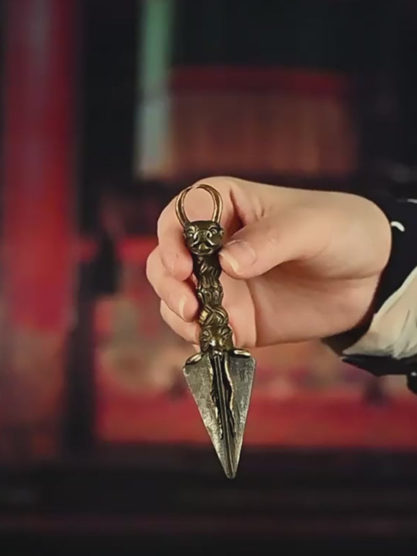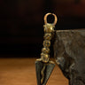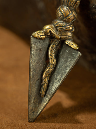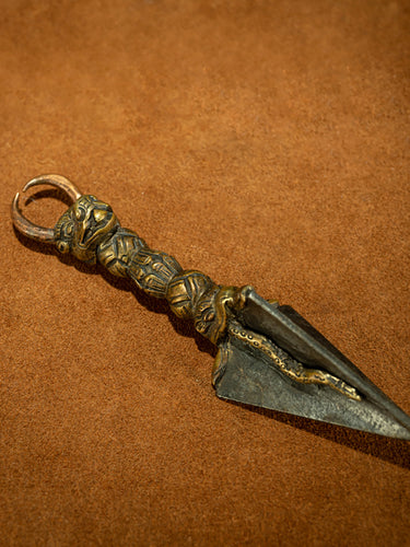 This Ming Dynasty Dorje Tibetan Personal Vajra Protector features a single-faced Mahakala bull head, carved with vivid expression and divine power. The lower portion displays intricate Makara carvings seamlessly integrated with the sharp Tietie iron shaft, emphasizing strength and authority. Though compact and suitable for personal use, it exudes the presence of a large ritual object. Wearing this Dorje provides courage, protection, and empowerment, radiating the powerful guardian energy of Tibetan ritual artifacts, making it perfect as a personal talisman or collectible.