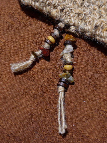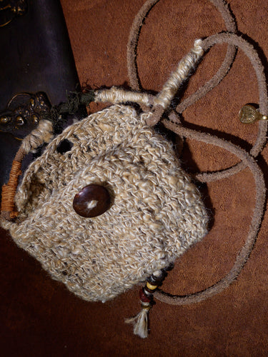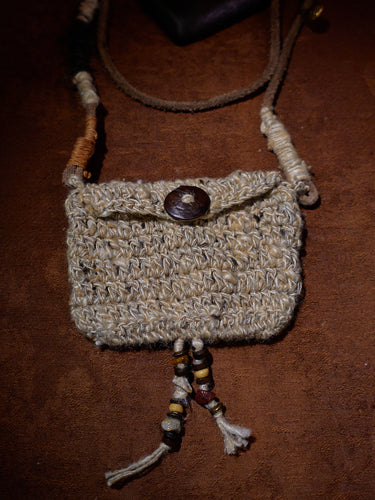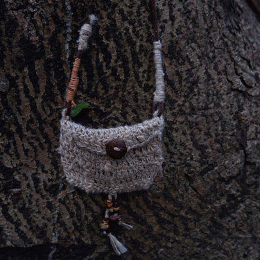 Infuse your space with a sense of peace and rustic charm with the Tranquility Handmade Decorative Pouch with Natural Beads. Crafted from eco-friendly materials like hand-dyed cotton threads, linen, leather cords, and adorned with amber, agate, yak bone beads, and brass accents, this unique pouch embodies the balance of natural beauty and artisan craftsmanship. The intricate details, such as the fruit-shell button and wooden beads, enhance its earthy and calming aesthetic.