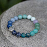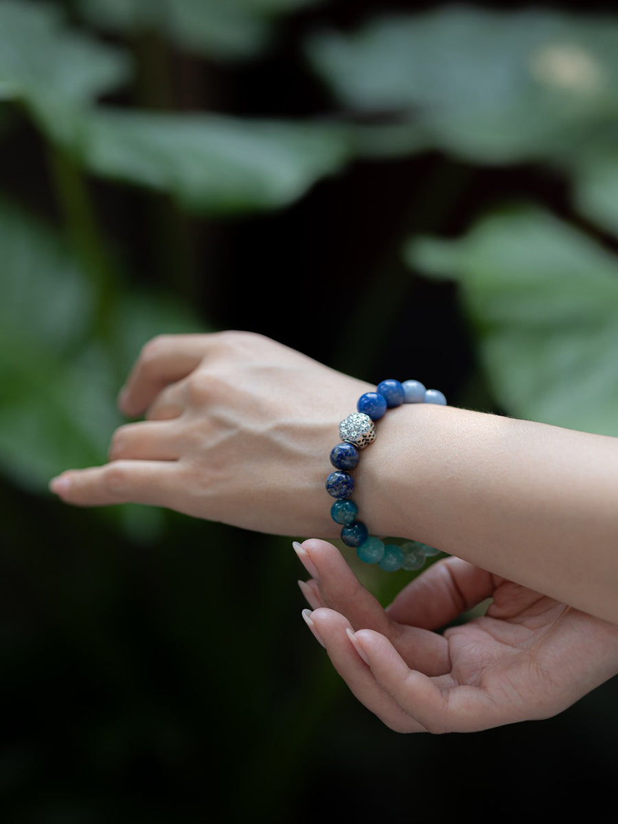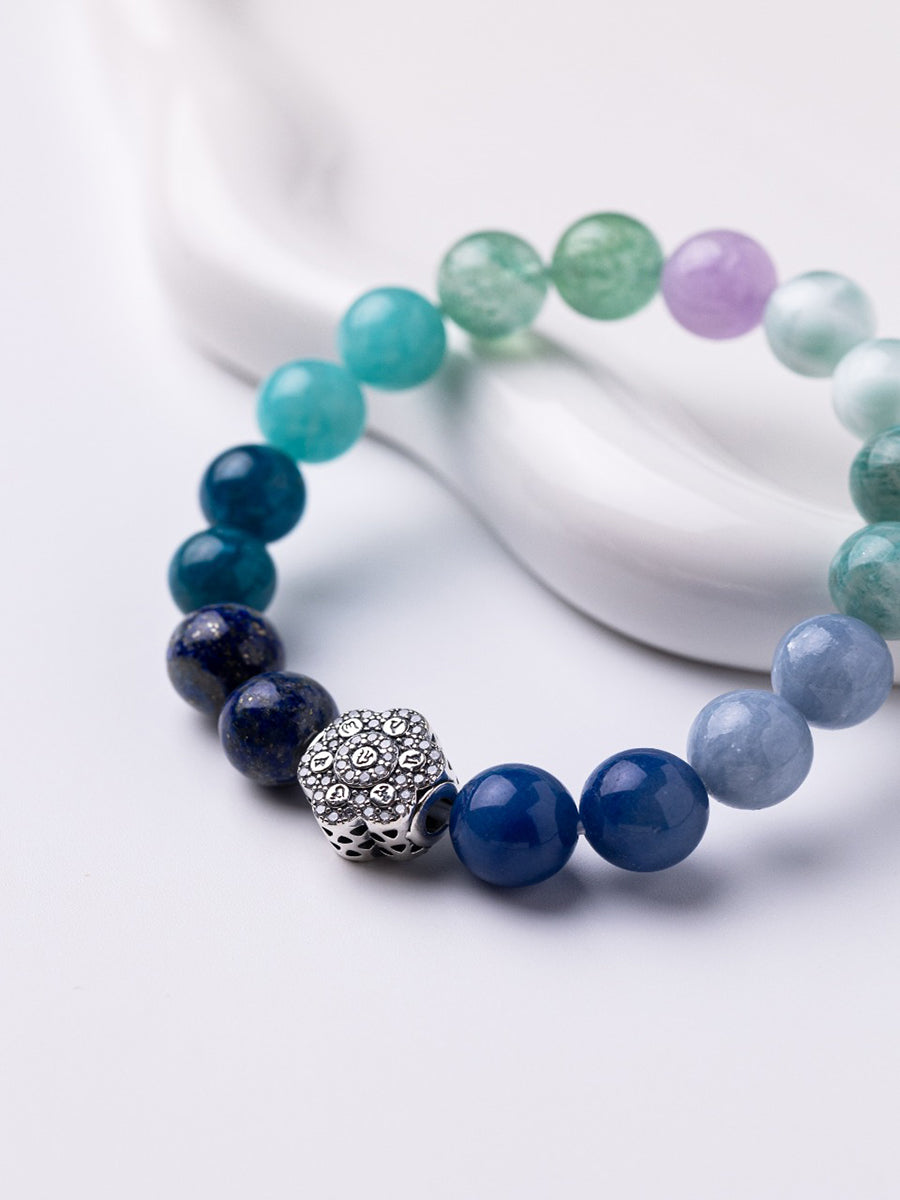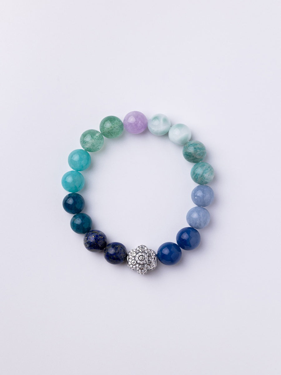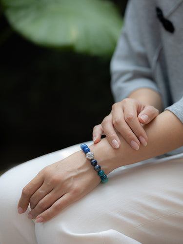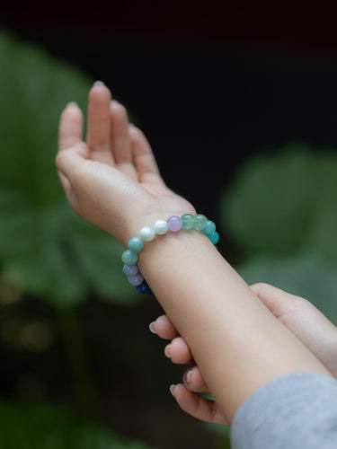The Guanyin Heart Mantra Multi-Gem Bracelet draws inspiration from the boundless compassion and wisdom of the Bodhisattva Guanyin. The bracelet is composed of natural gemstones—Lapis Lazuli for wisdom and clarity, Aquamarine for calm and emotional peace, Amazonite for courage and balance, Green Aventurine for luck and harmony, and Amethyst for spiritual awakening and compassion. The gradient of hues from deep blue to soft violet evokes the serene radiance of Guanyin’s merciful light. Wearing this bracelet nurtures inner peace, dissolves negativity, and attracts harmony in life, guiding the wearer toward balance, prosperity, and spiritual fulfillment.
