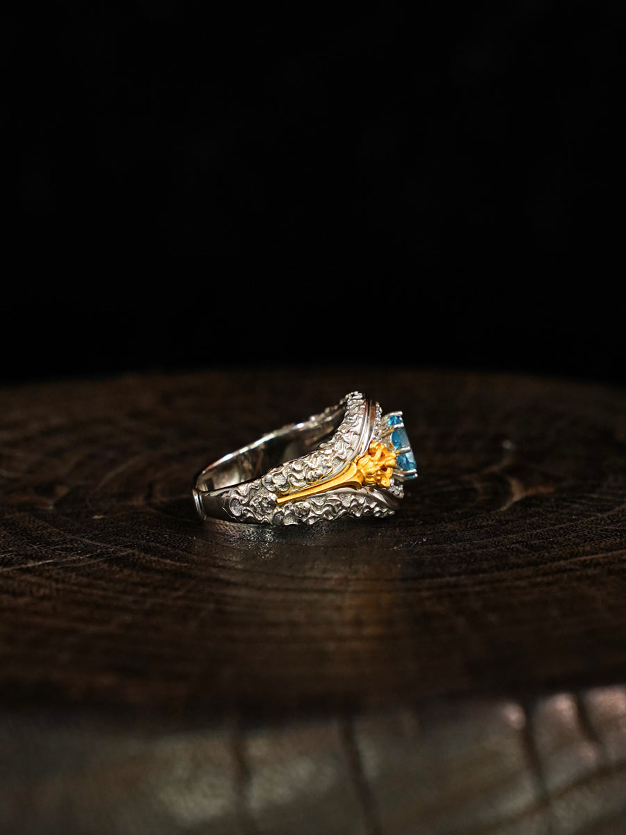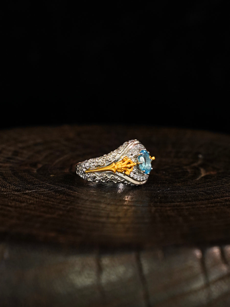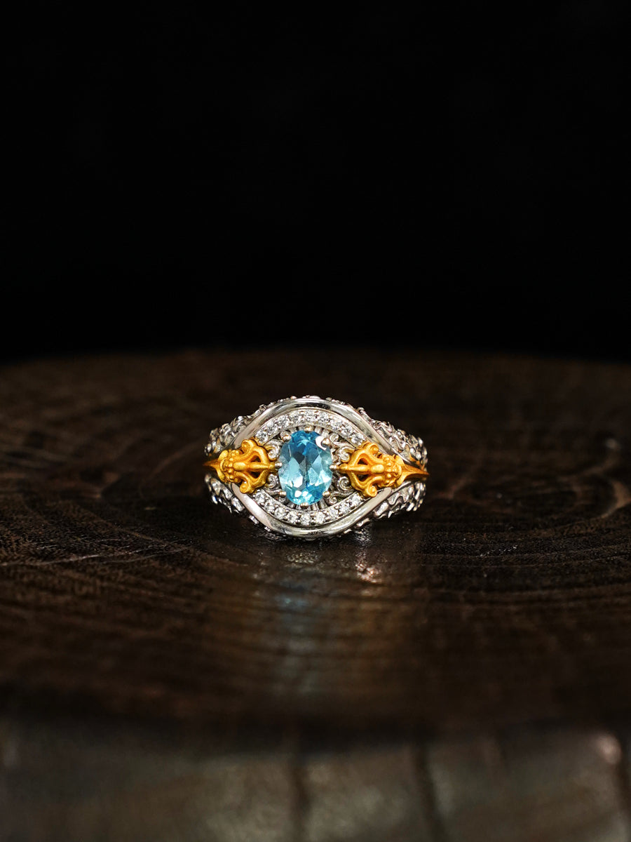 The Celestial Balance Vajra Silver Ring embodies divine wisdom, calm focus, and spiritual strength. Inspired by the sacred Vajra symbol, it represents the union of compassion and power — the enlightened path of inner balance. Crafted in sterling silver and set with a tranquil blue gemstone, this ring radiates protective energy and serene clarity. Each hand-carved Vajra detail channels blessings of courage and spiritual grounding, making it a refined talisman for those seeking strength and peace in both mind and spirit.