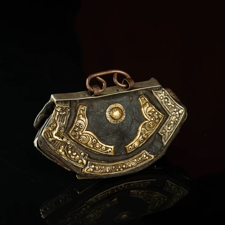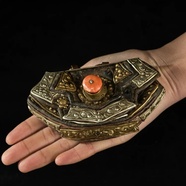 Qing Dynasty Tibetan Yak Leather Coral Inlaid Antique Wallet from Tibet