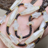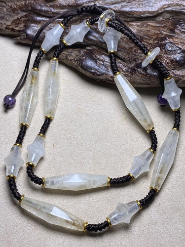 Each elongated quartz bead is hand-cut and polished, then interwoven with traditional cord craftsmanship that echoes the rhythm of prayer and intention. The necklace’s geometric design mirrors the path of spiritual flow — steady, balanced, and luminous. The Clarity Flow Necklace is not only a piece of jewelry but a spiritual tool, guiding its wearer toward inner stillness, clarity, and renewal.