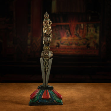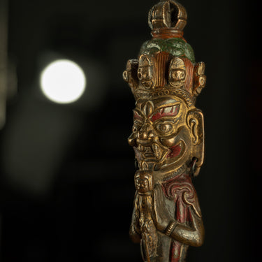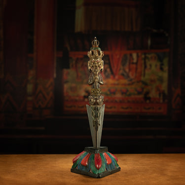 This Phurba embodies the forceful clarity of protection in Vajrayana tradition—its triple-blade tip piercing illusion, ego, and fear. With a serpent wrapped around its shaft and a ritual deity crowned at the top, it is forged to subdue chaotic forces both within and without.