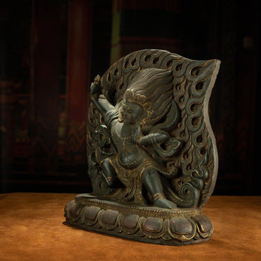 Carved from rare Mani black stone, this majestic 16th-century Vajrapani embodies unstoppable force and enlightened protection. Flames dance behind his dynamic stance—each detail a prayer for transformation and strength.