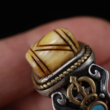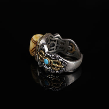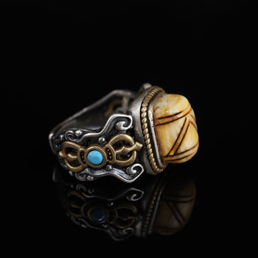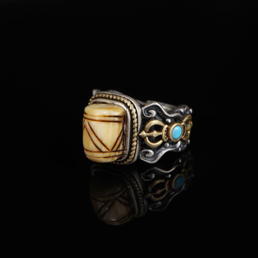 Design: This sterling silver ring is carved from mammoth ivory. The dual blessing of the tiger tooth dzi bead totem and the vajra totem enhances the evil-repelling effect