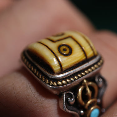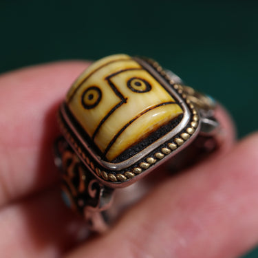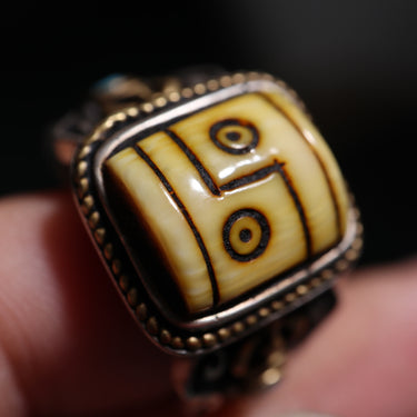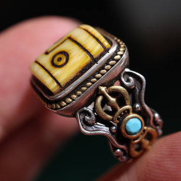 Design: This sterling silver ring is carved from antique mammoth ivory. The two-eyed dzi beads can promote family harmony and attract love. The vajra totem on the ring can ward off evil and prevent disasters.