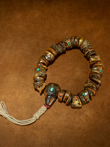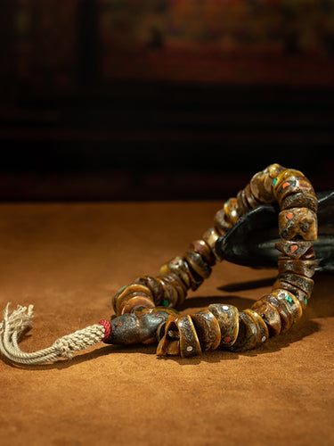 This Qing Dynasty Tibetan Rare Multi-Gem Inlaid Old Mala Bead Bracelet consists of 38 exquisite beads and was inherited from a Nyingma Yoga Master lineage. Wearing it provides vitality, spiritual protection, and mindfulness, helping to stabilize emotions, enhance focus and courage, while also supporting daily energy balance and spiritual practice. Its craftsmanship and rarity make it a highly valuable collectible Tibetan bracelet.