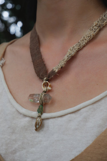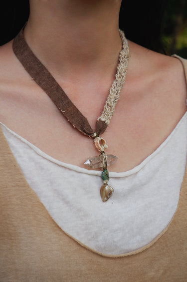 The Spirit of the Earth Pendant embodies the essence of Himalayan nature and spiritual craftsmanship. Each element—phantom quartz, handwoven silk, shells, and mountain seeds—echoes ancient symbols of life and renewal. In Himalayan rituals, natural stones and organic fibers are used as offerings to the earth, representing gratitude for vitality and balance. The fusion of brass and crystal amplifies the energy of grounding and awakening, encouraging the wearer to reconnect with their inner source of strength.