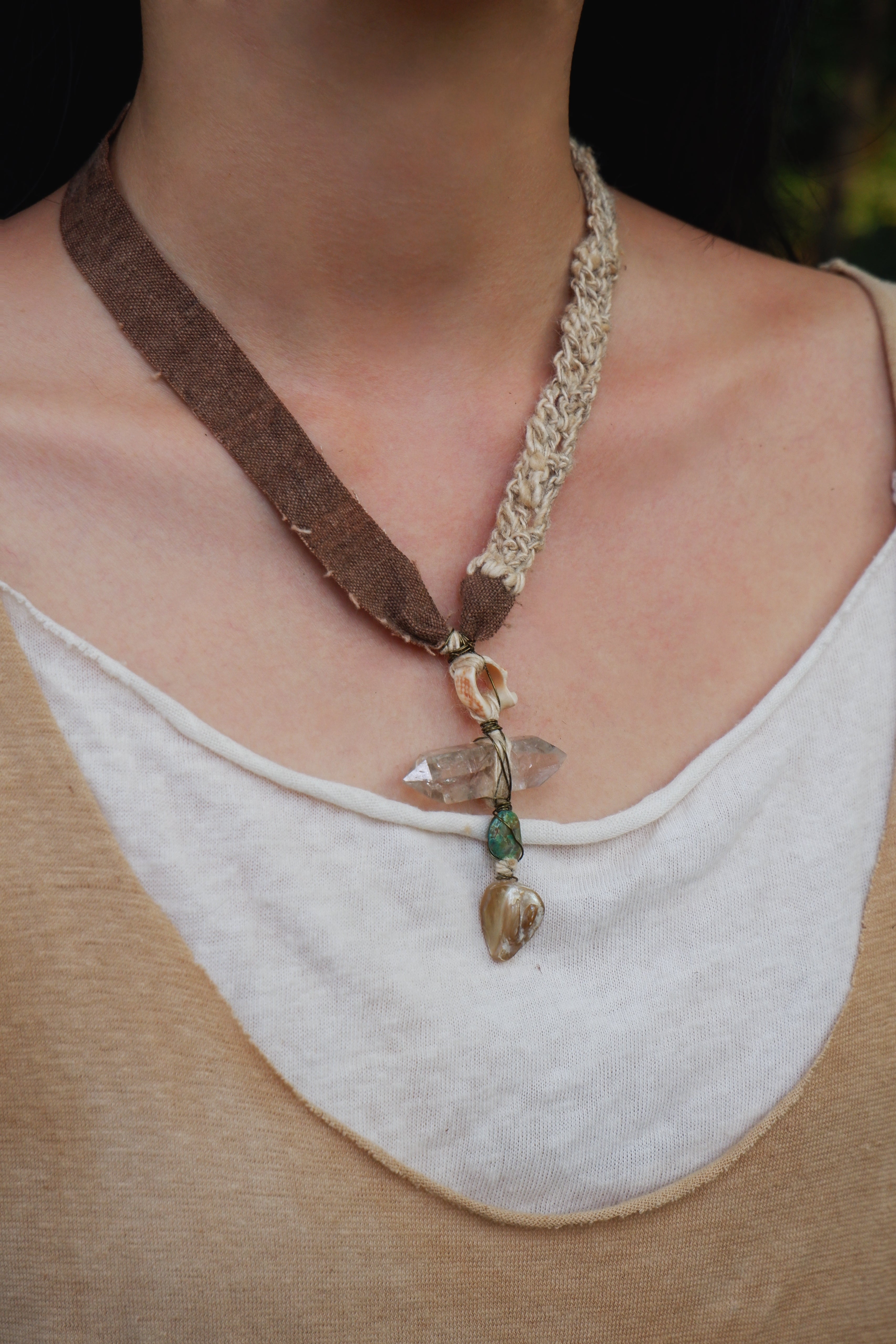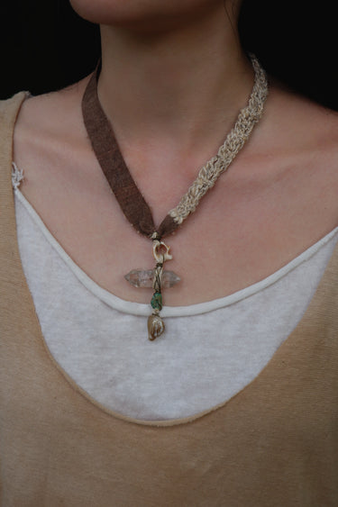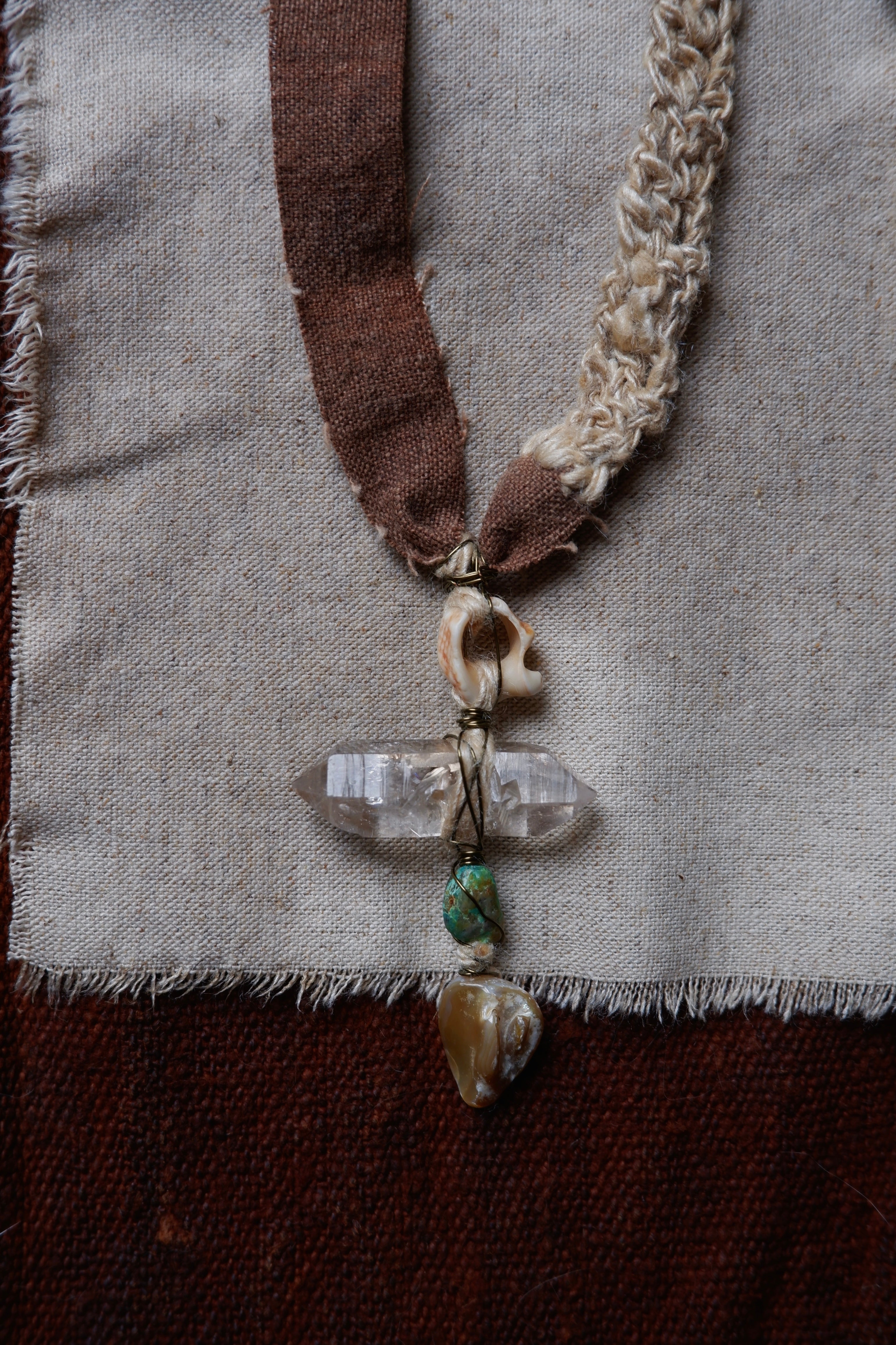 Material: Phantom Quartz, Vintage Fabric, Silk, Shells, Natural Stones, Seeds