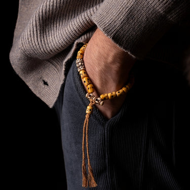 Embrace the essence of ancient wisdom and spiritual protection with this handcrafted Tibetan yak bone bracelet. Made from aged yak bone beads and adorned with intricately carved Buddhist symbols, this piece is a true testament to resilience and spiritual strength. The natural agate accents enhance grounding energy, while the aged bone carries the sacred essence of Tibetan traditions. Designed to be worn daily or during meditation, this bracelet serves as a powerful shield against negative energy and a reminder of one’s inner fortitude.