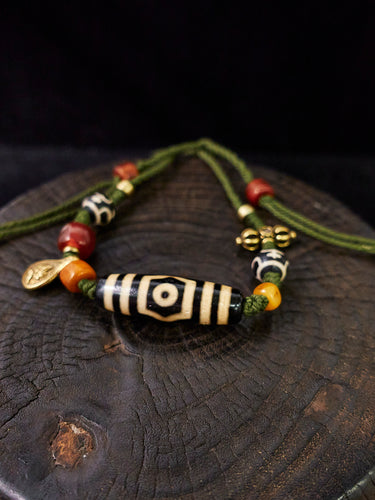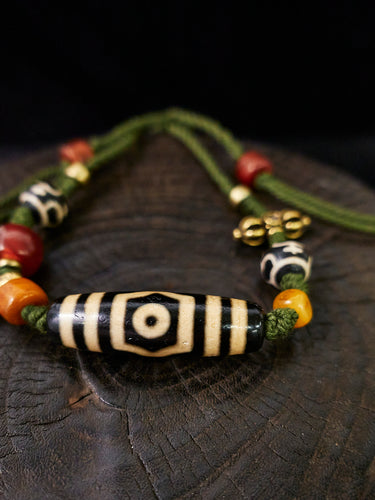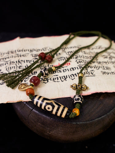 Embrace the powerful energy of protection with the Tri-Eye Guardian Amulet Necklace, a meticulously handcrafted pendant from Kailash Energy that combines traditional artistry with spiritual purpose. Featuring the sacred three-eyed Dzi bead, this necklace symbolizes protection, prosperity, and wisdom, making it an ideal companion for those seeking strength and spiritual fortitude. The intricate handwoven design, crafted with care and precision, elevates this piece into a work of art, embodying the protective essence of Tibetan heritage.