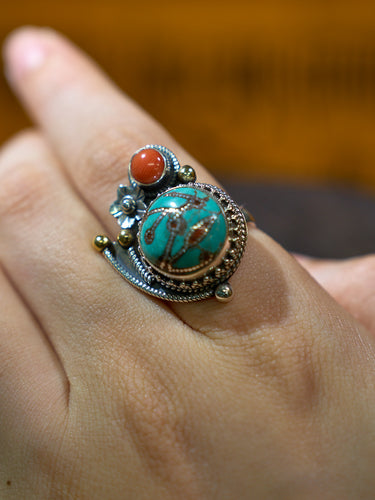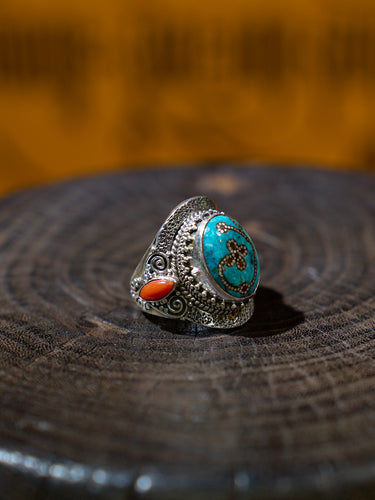 In Himalayan culture, turquoise and red coral are regarded as sacred gemstones with deep spiritual significance. They are often used in ritual objects, prayer beads, and personal adornments, symbolizing protection, purification, and connection to higher wisdom. Turquoise is seen as a guardian stone, offering peace and spiritual clarity, while red coral embodies compassion, vitality, and the energy of life itself. Local people wear these gemstones in their daily lives and during spiritual practices as tools for meditation, healing, and attracting harmony. This ring unites traditional Himalayan artistry with the natural energy of turquoise and red coral, making it not only a piece of jewelry but also a meaningful charm of good luck and spiritual guidance.