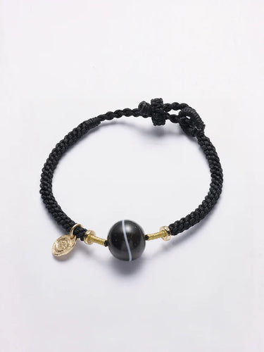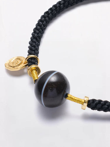 This bracelet features a high-quality Single Line Dzi bead as its centerpiece, with the black and white natural stripes representing the harmony between Yin and Yang, and the balance of the universe. Paired with gilded accents and durable cotton rope, the design is both simple and elegant, embodying a sense of serenity and strength. Wearing it offers not just physical protection but spiritual grounding, perfect for both daily wear and meditation practice.