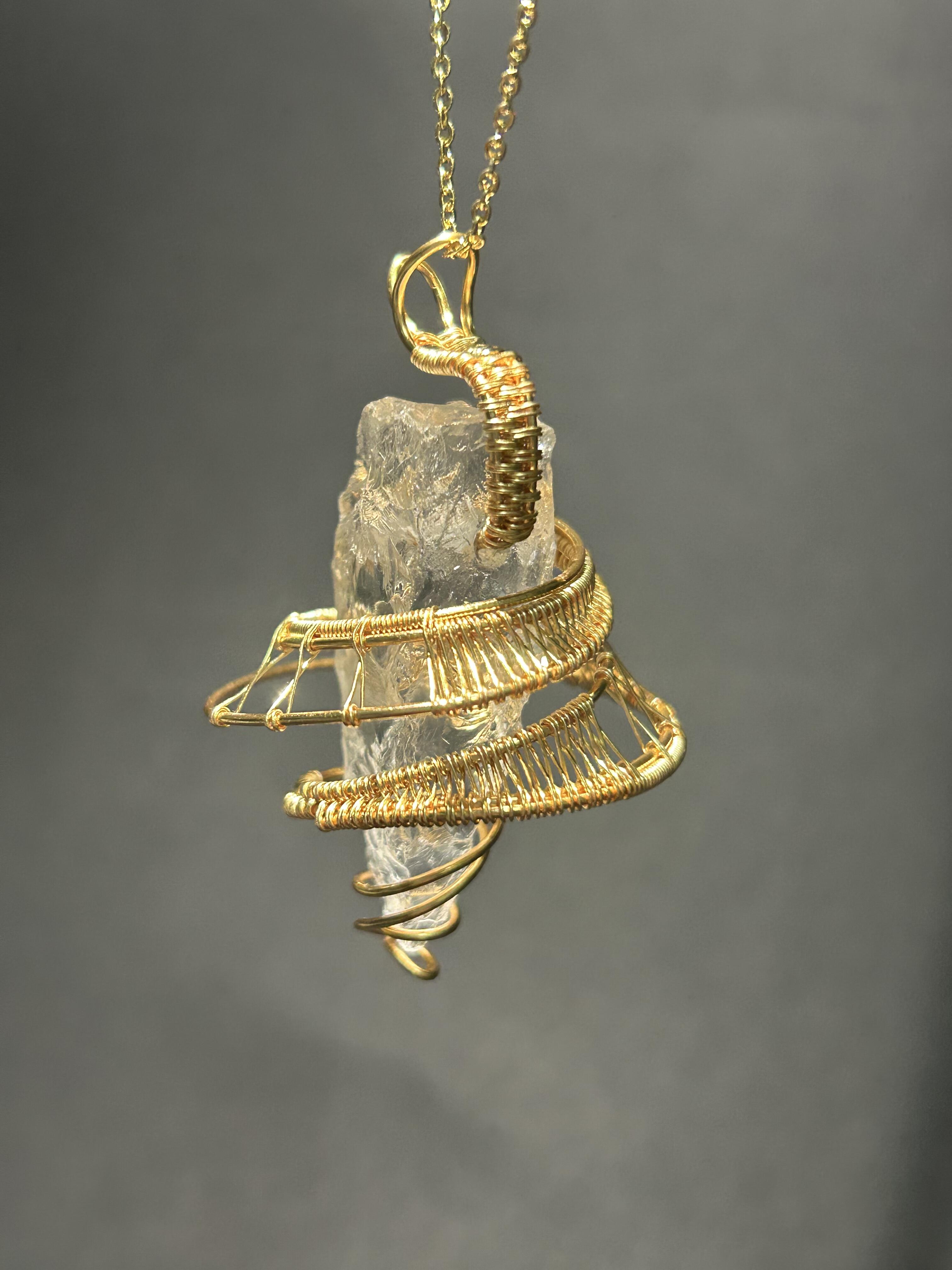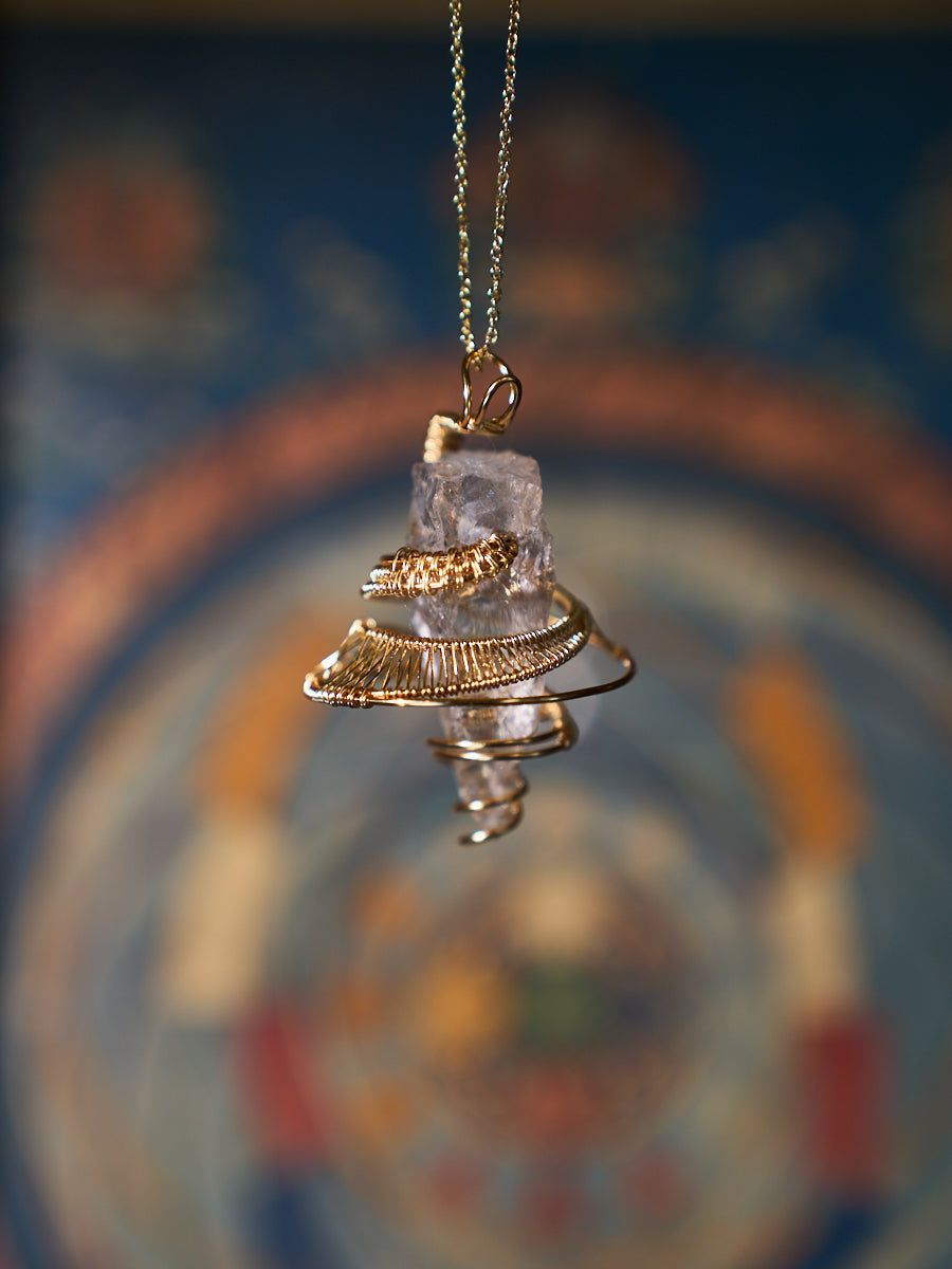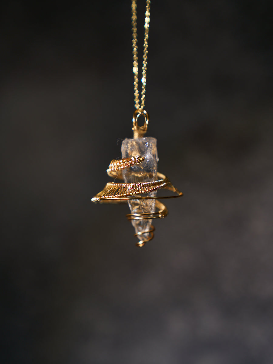 Clear Quartz has been honored across civilizations as the most fundamental and awakened form of crystal energy. Transparent and light-bearing, it is often regarded as the King of Crystals—not through force, but through purity. This necklace features a naturally formed Clear Quartz, preserved close to its original state and gently held by hand-wrapped metal. The spiral form echoes ancient symbols of continuity, protection, and the flow of life, allowing energy to move freely rather than be confined.