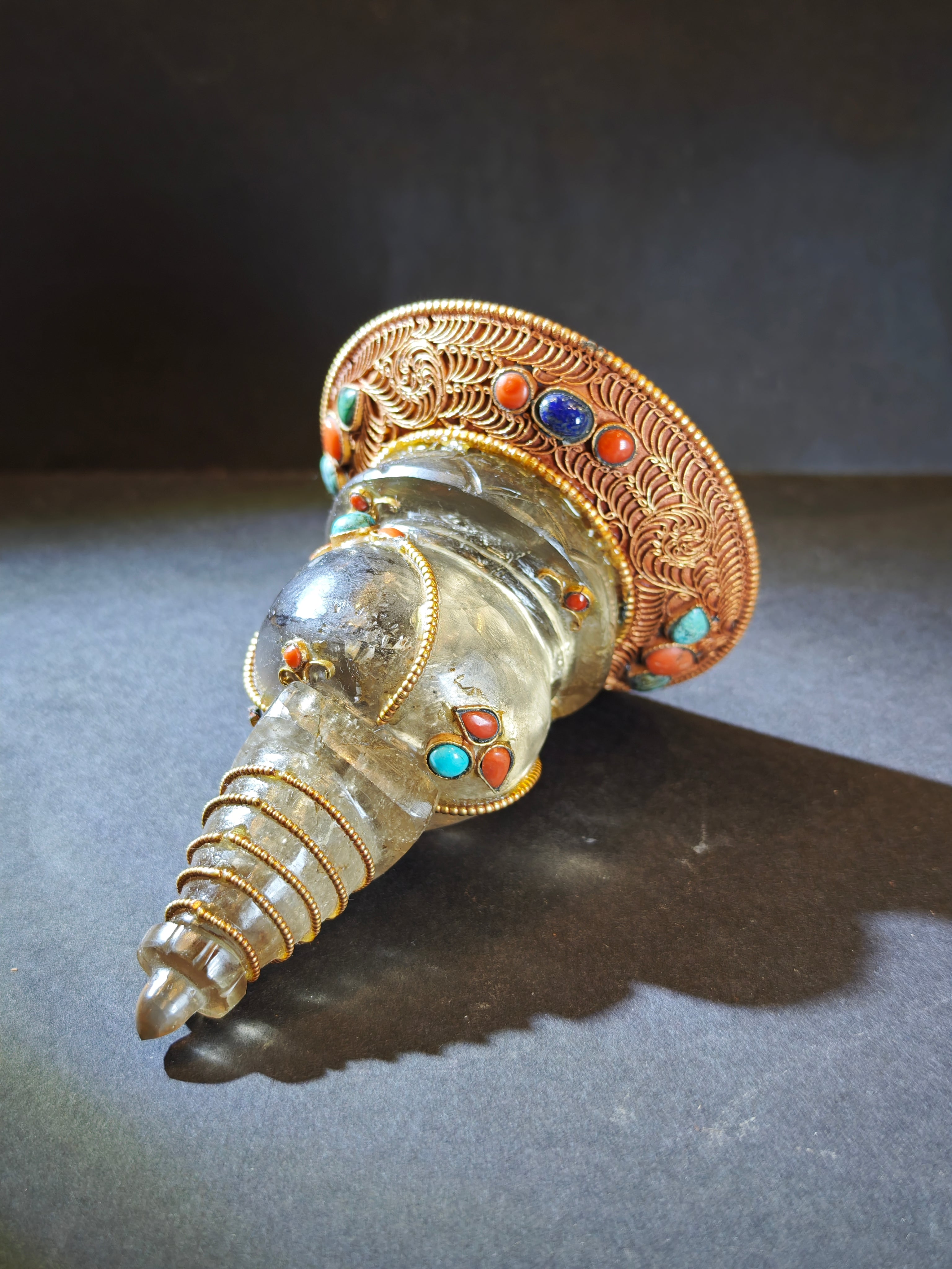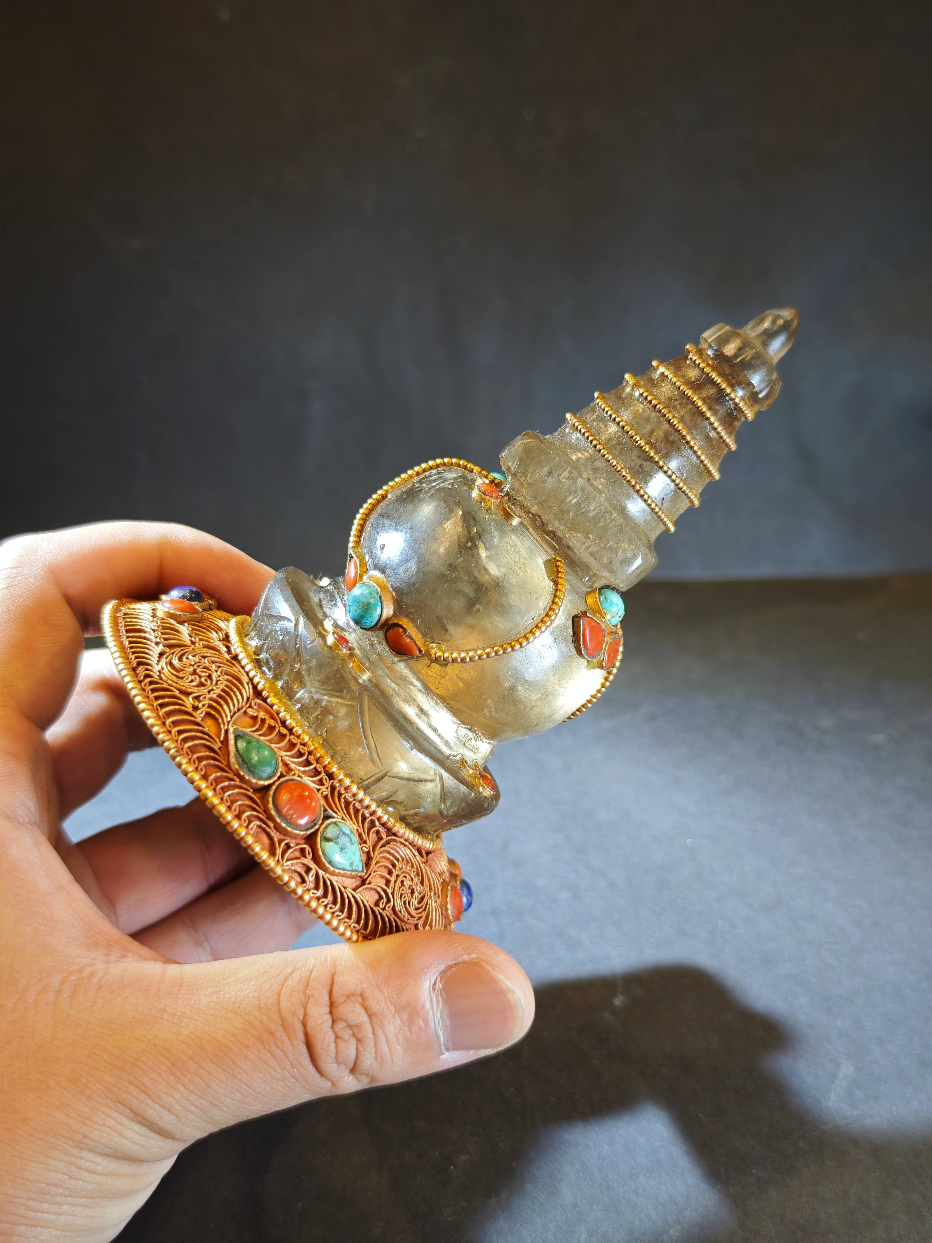 Naturally Etched Himalayan Smoky Quartz Stupa Sculpture