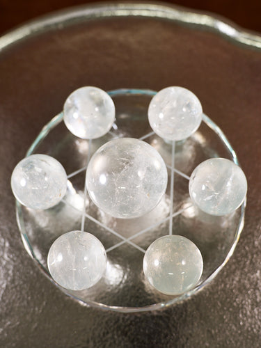 This crystal grid set features seven hand-polished clear quartz spheres, a central quartz tower, and a glass grid plate arranged in a sacred geometric formation. Clear quartz is widely valued for enhancing clarity, stabilizing energy, and amplifying intentions. The arrangement helps create a focused energetic field, supporting meditation, purification, and emotional balance. Whether used for spiritual practice or as a decorative piece, the set brings refreshing brightness and a calming presence to any space.