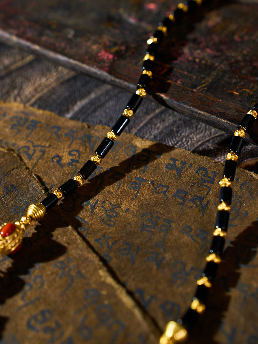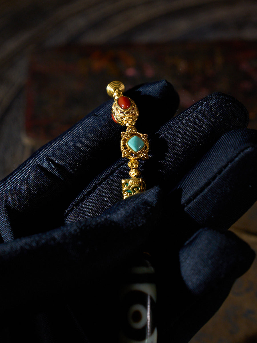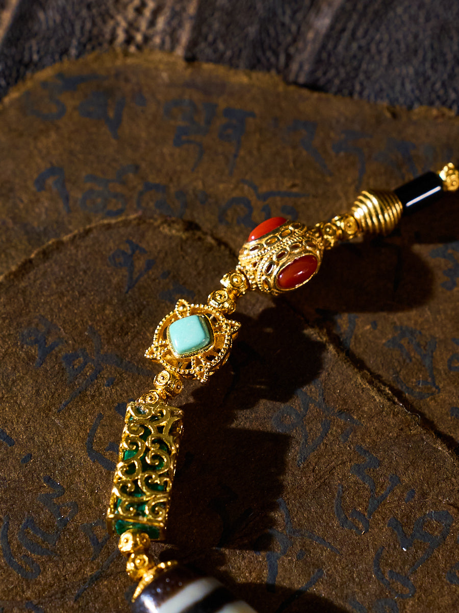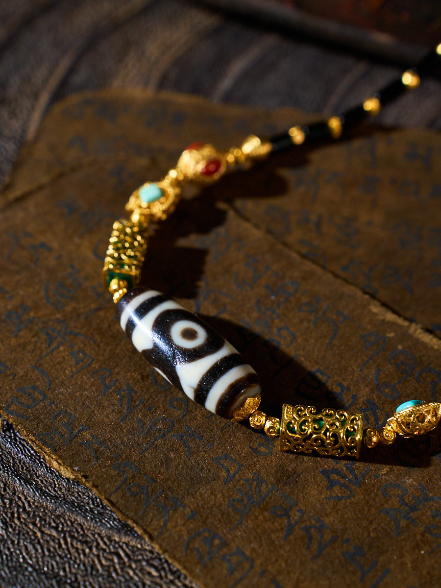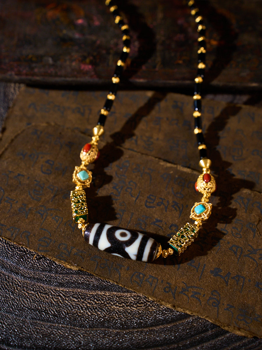 Material: Panda Three-Eyed Dzi Bead, Black Agate Tube Beads, Turquoise, Red Agate, 18K Gold-Plated Copper