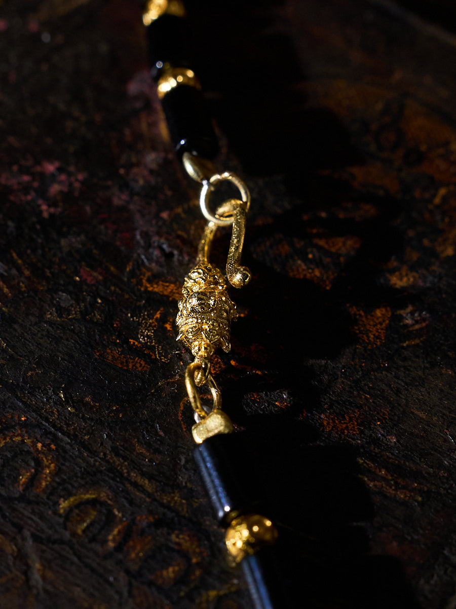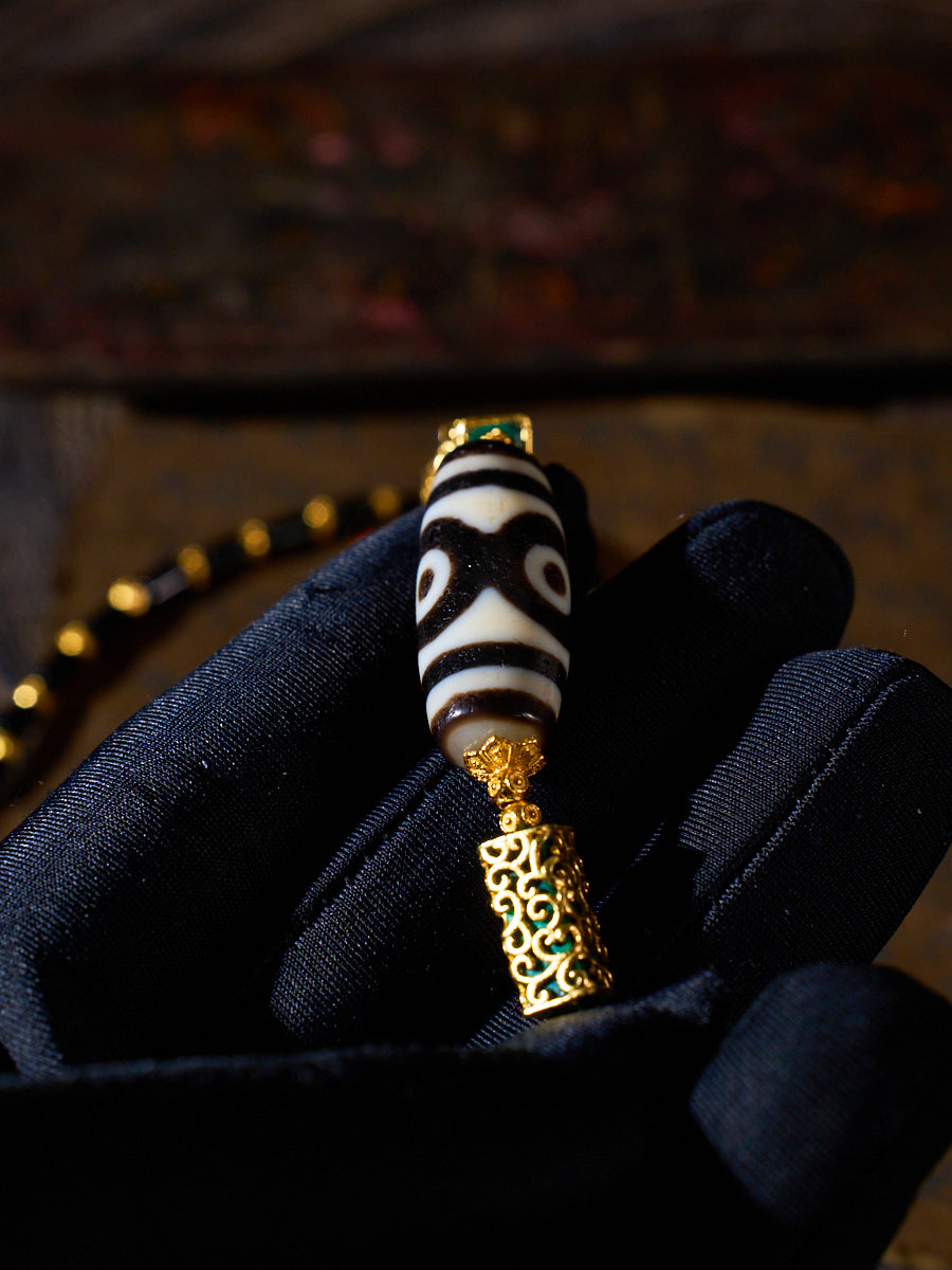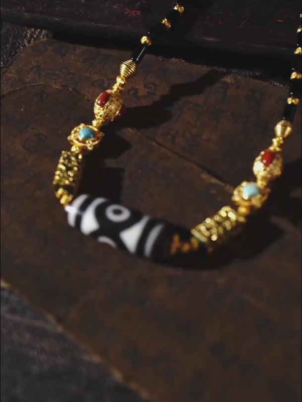 Handcrafted by skilled Tibetan artisans, the striking Panda Three-Eyed Dzi centerpiece is framed by sleek black agate tube beads for grounding protection, intricate 18K gold-plated filigree spacers inlaid with turquoise and red agate for authentic Tibetan elegance, and a secure gold lobster clasp for refined wearability. The bold contrast of black, white, and gold creates a powerful statement piece that honors centuries of sacred Tibetan craftsmanship.