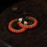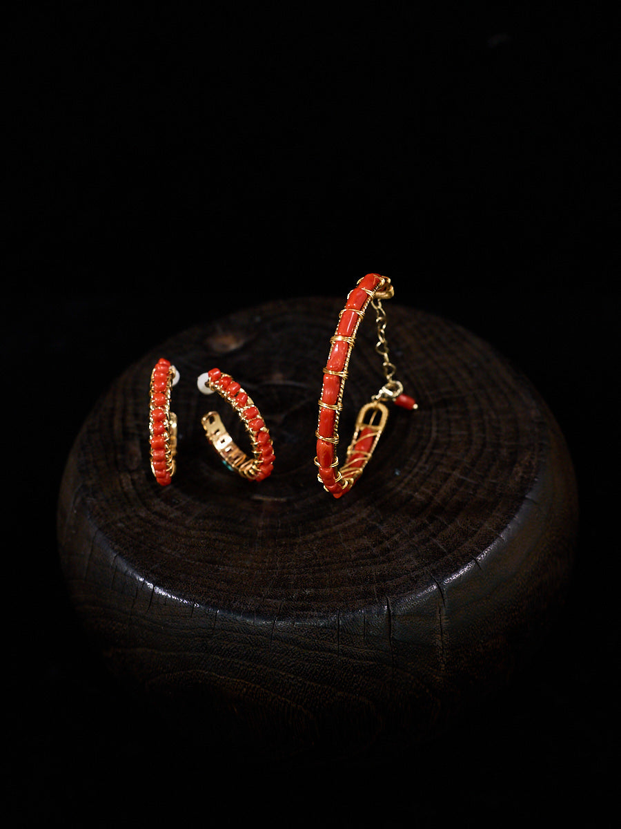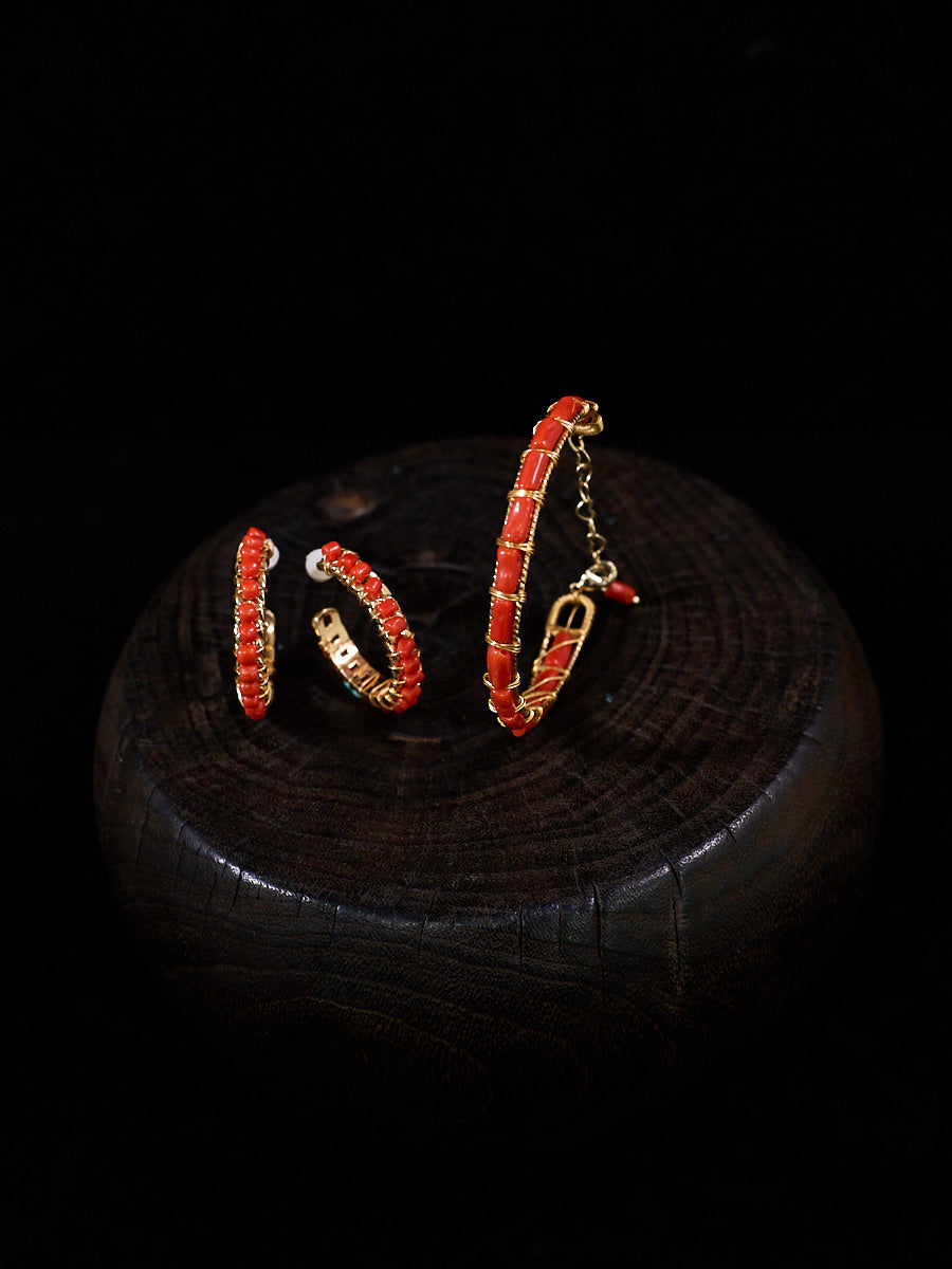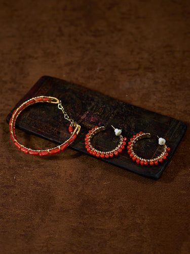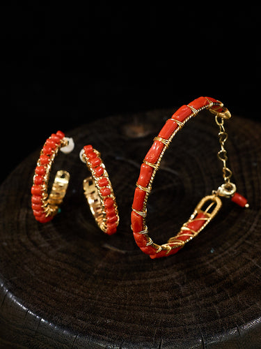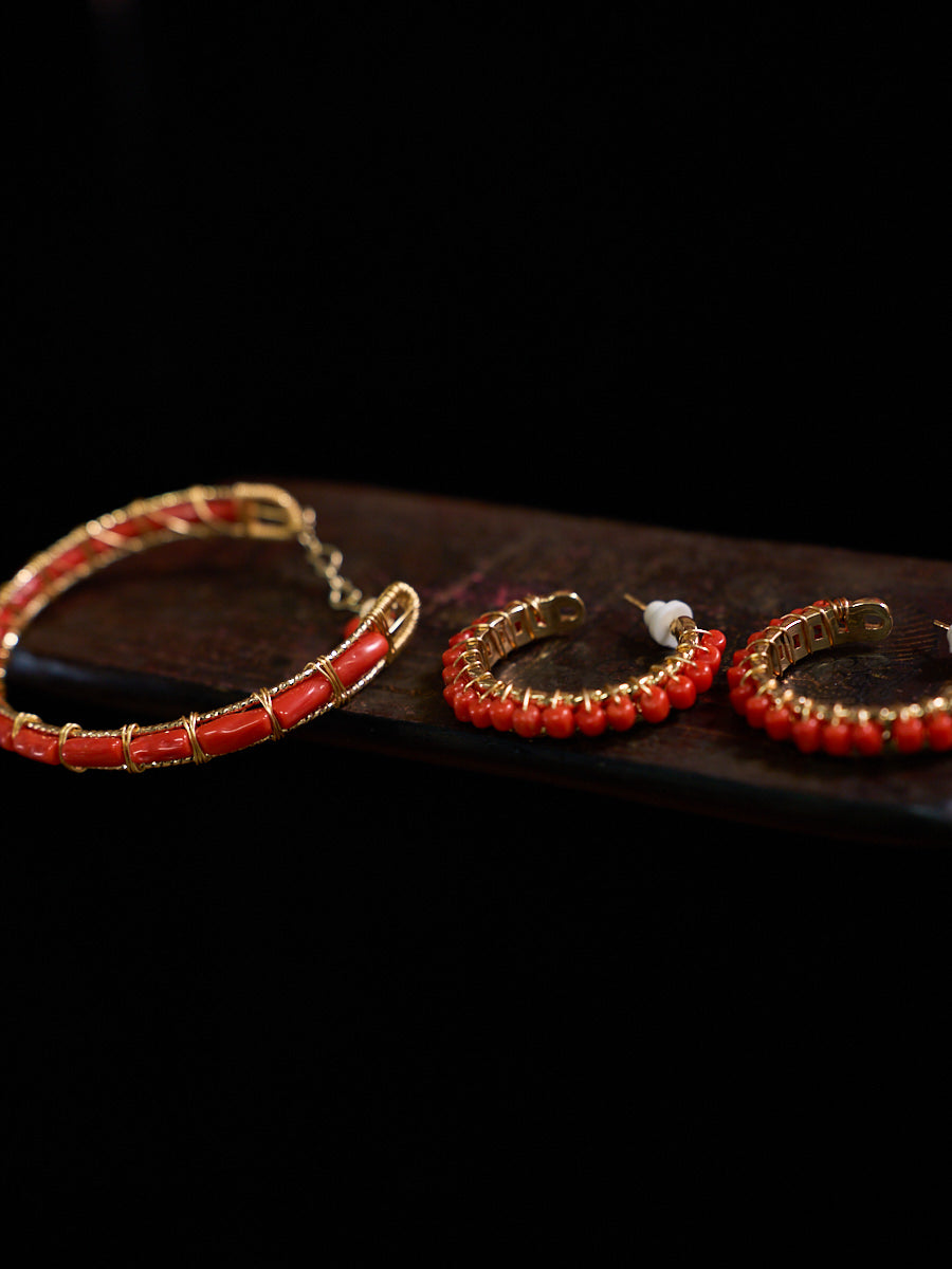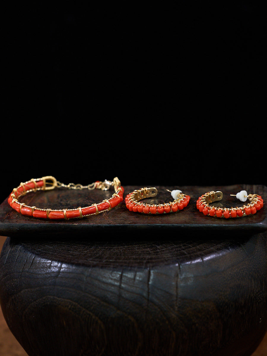 Radiant Coral Wire-Wrapped Gold Hoop Earrings