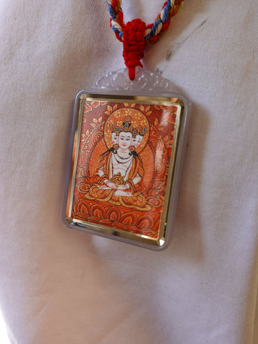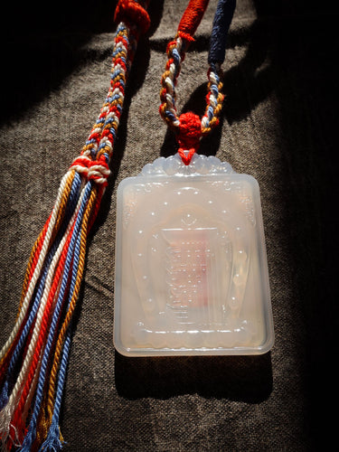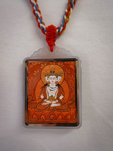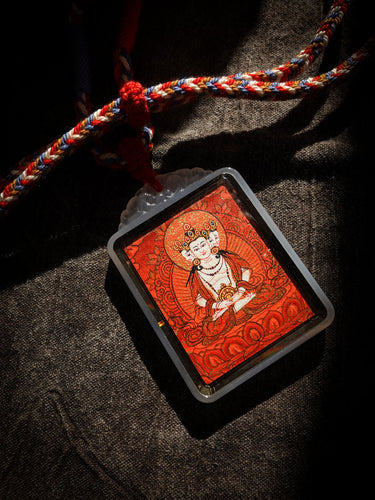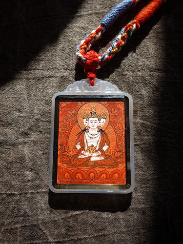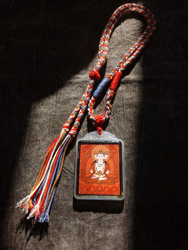 This pendant features the sacred image of Vairocana (the Great Sun Buddha), set within a strong agate case and adorned with a multicolor woven cord symbolizing blessings and harmony.