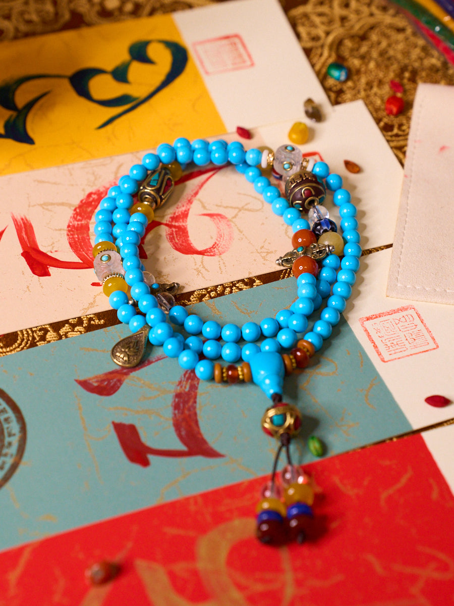 The Robust Wealth Sturdy Mala Necklace embodies the convergence of material prosperity and spiritual protection, inspired by time-honored Himalayan traditions. Meticulously hand-strung with turquoise beads, handmade copper beads, yellow agate, red agate, black agate, glaze barrel beads, and a central "Om Mani Padme Hum" copper charm, each element is chosen for its profound symbolic energy. Turquoise, long cherished as a talisman of protection and good fortune, forms the foundation, while the symphony of agates—yellow for attracting wealth and confidence, red for vitality and courage, and black for grounding and stability—works in concert to build emotional and physical resilience. The recurring "Om Mani Padme Hum" mantra, deeply engraved on the copper bead, continuously infuses the mala with compassion and divine blessings with every recitation, transforming it into a dynamic instrument for cultivating a life of robust wealth and unshakable calm.