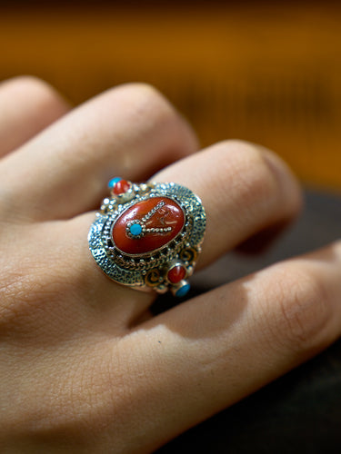 Red Coral and Turquoise Sterling Silver Ring – Talisman of Love, Healing, and Himalayan Harmony