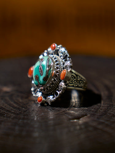 Sacred Turquoise Coral Silver Ring Spiritual Healing Good Luck Jewelry