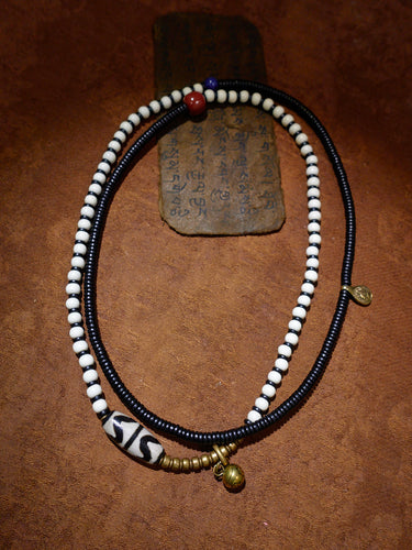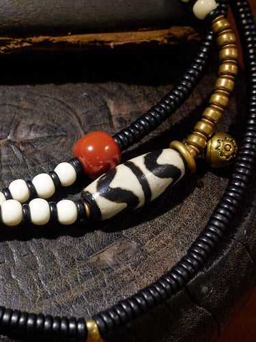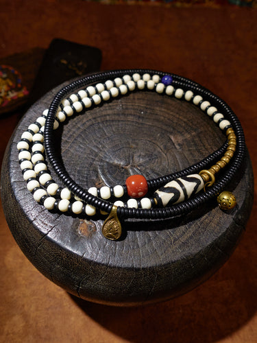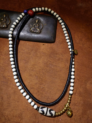 This bracelet brings together the profound symbolism of the Himalayan tradition through its carefully chosen materials: the mystical dzi bead, protective ebony wood, and sacred deer bone. Dzi beads are revered for their spiritual power, often believed to ward off negativity and channel wisdom. Ebony wood, known for its grounding energy, balances the mind and spirit, while deer bone symbolizes resilience and connection to nature.