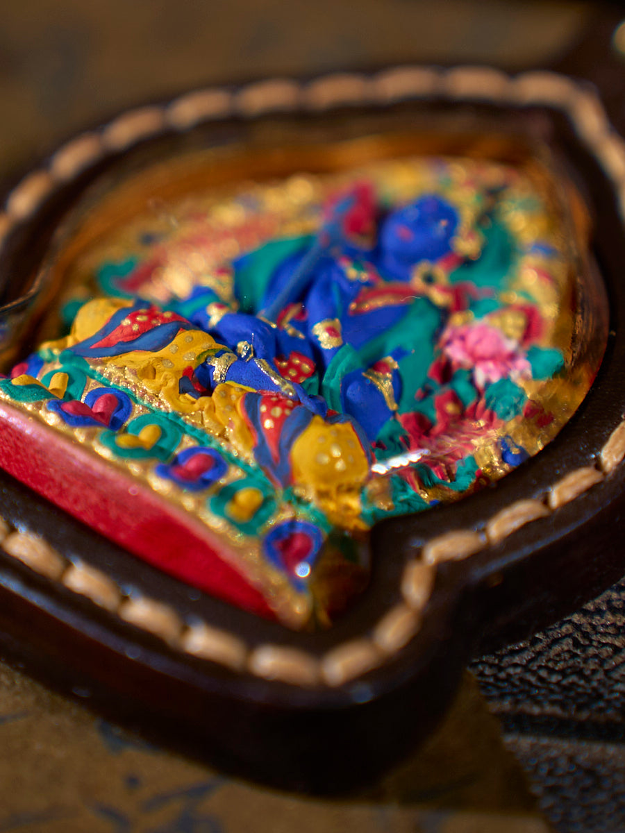 Handcrafted from natural mineral pigments and leather, this pendant reflects the serene essence of Tibetan artistry, merging beauty with devotion.