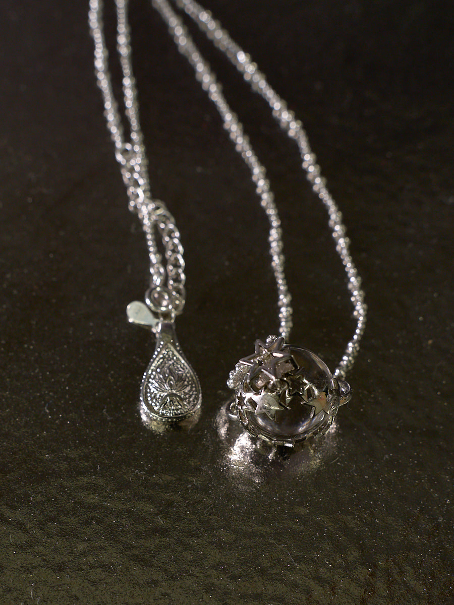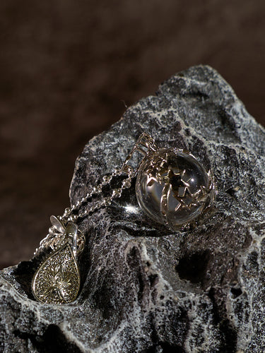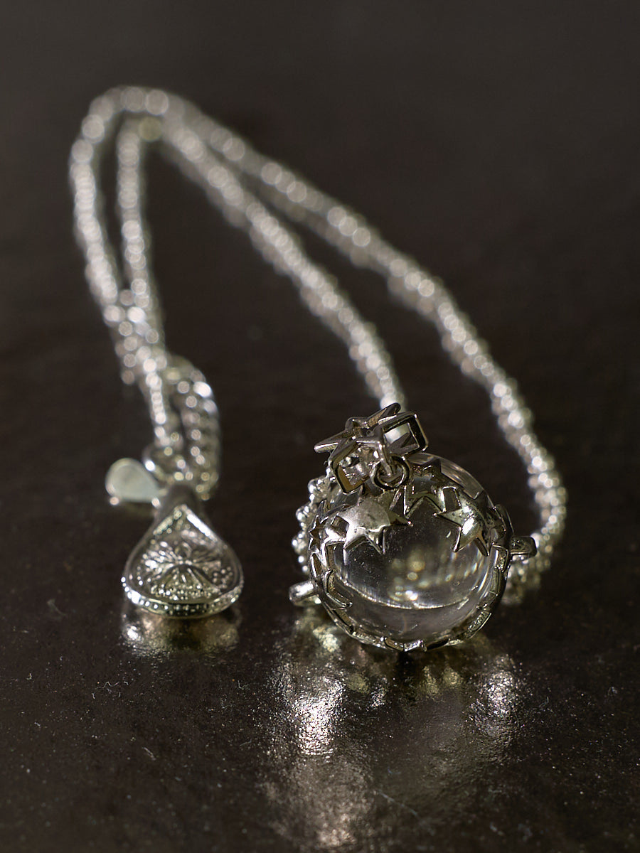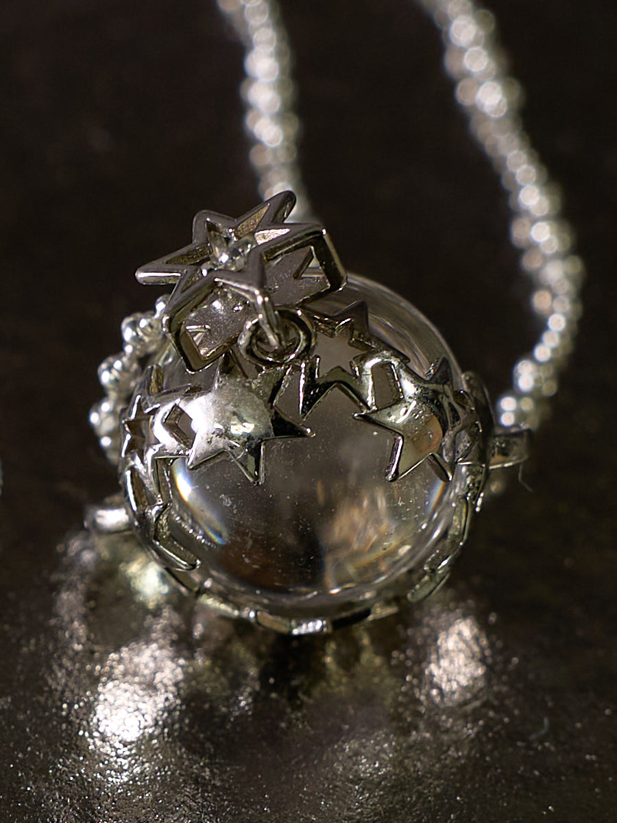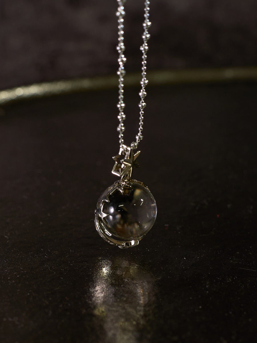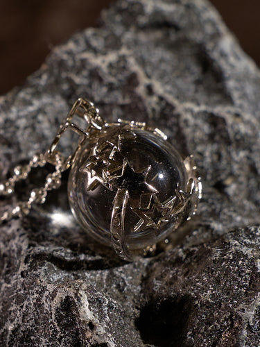 This pendant features a luminous clear quartz sphere, elegantly set within a silver ring and star accent, evoking cosmic harmony and spiritual alignment.