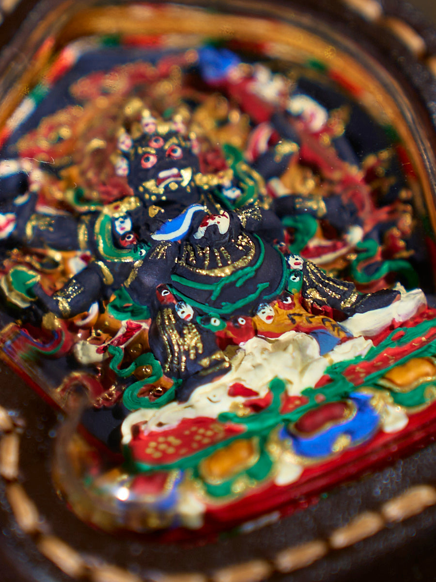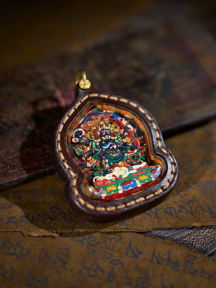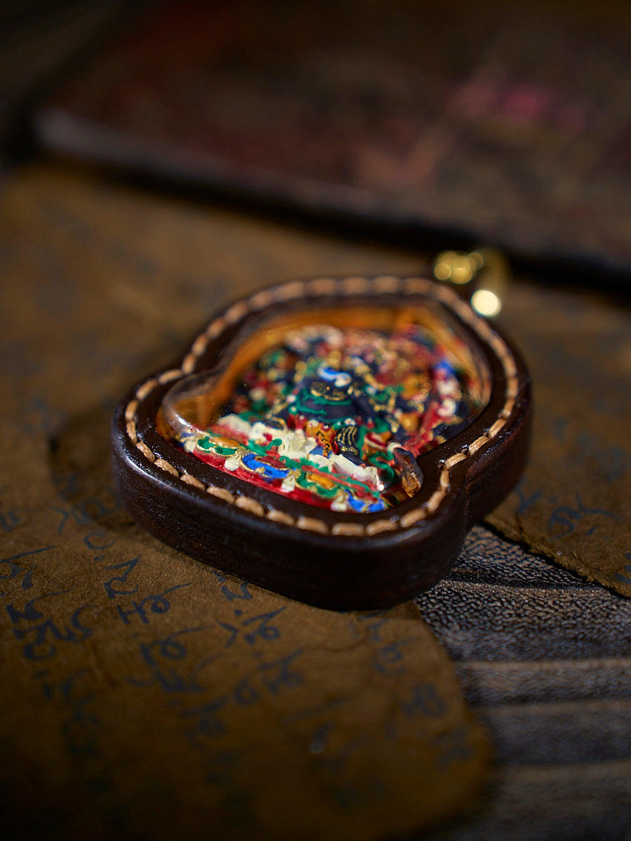 Handcrafted from mineral pigments and leather, this pendant preserves the sacred depth of Tsa Tsa artistry, exuding both ferocity and grace.